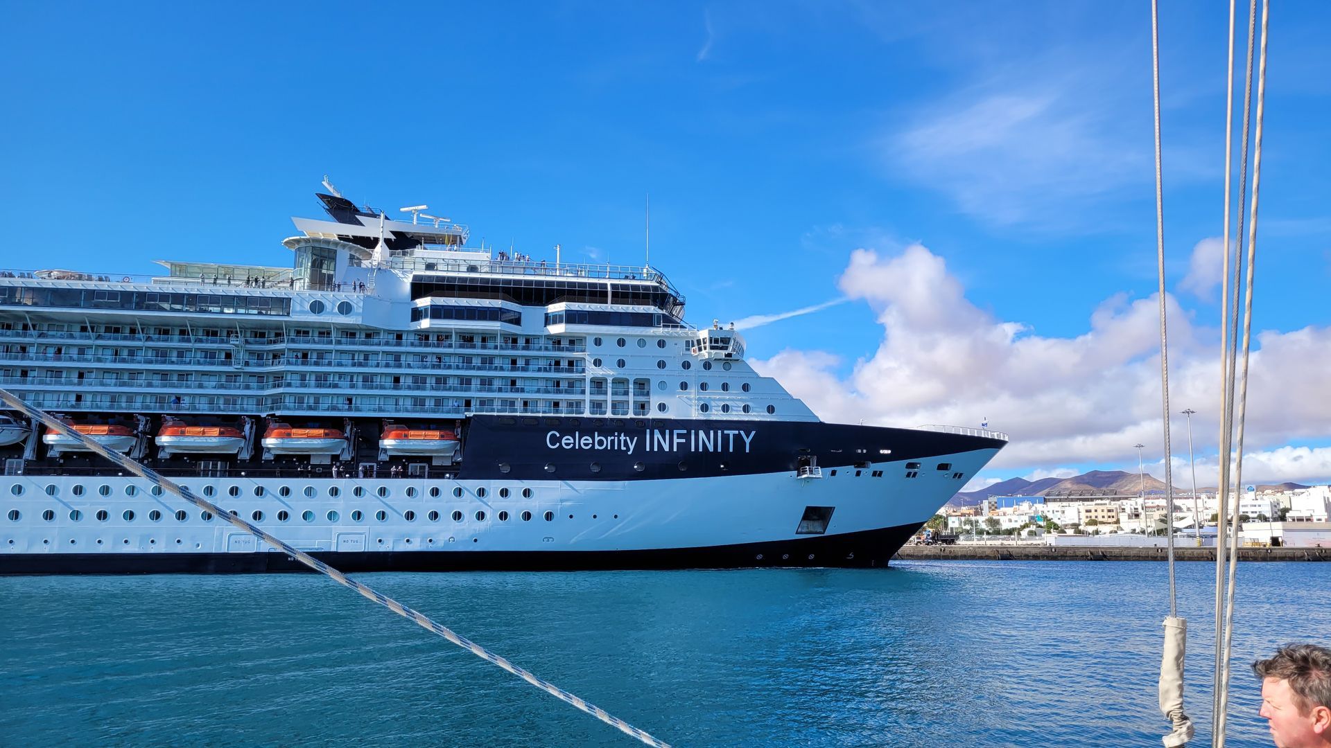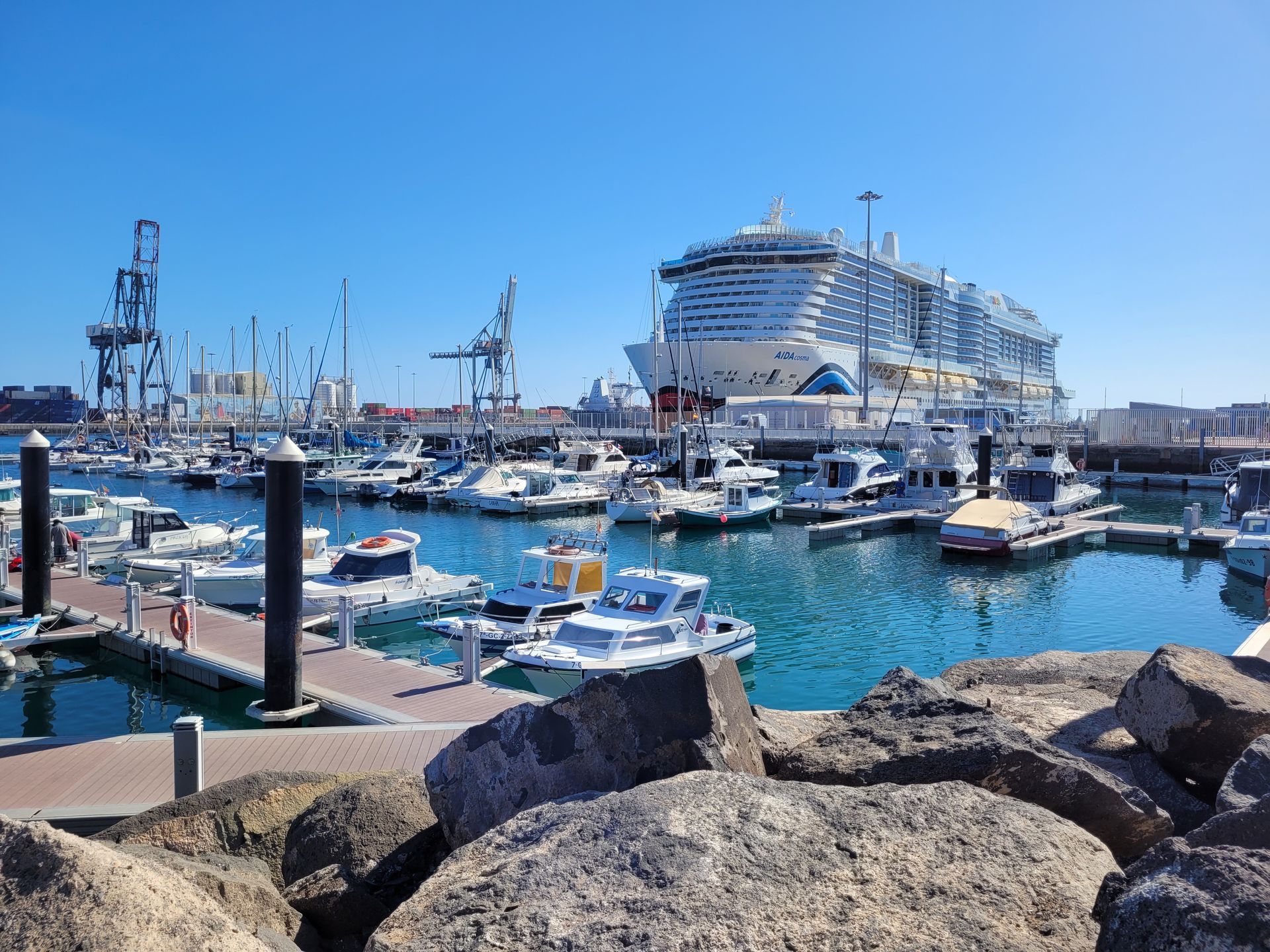Heute ist der große Tag des Starts unseres Törn. Wir können es locker angehen, dank Gernot. So bleibt Zeit für ein ausgiebiges Frühstück, Duschen, letzte Einkäufe. Um 12:40 legen wir gepflegt ab, bekommen aber noch eine Schrecksekunde, weil ein neues Kreuzfahrtschiff auftaucht. Gernot geht dem Kahn gekonnt aus dem Weg. Auf offener See emfängt uns eine sanfte Brise, die zum Segelsetzen einlädt. Wir setzen das Großsegel und Genua-Vorsegel. Da der Wind es zulässt, tauschen wir bald die Genua durch unser größtes Segel, den Genacker. Unser Ziel Kapverden liegt auf Kurs 222° und sollte in ca. 6 Tagen zu erreichen sein. Dort wird Kerstin erwartet, die aus Nordschweden anreisen wird. In der Zwischenzeit sendet sie eindrucksvolle Bilder mit viel Schnee. Wir segeln mit moderaten 5kn an einer schroffen Mondlandschaft entlang, unterbrochen nur durch Ansammlungen von hasenstallähnlichen Hotels und Apartmentsanlagen. Unverständlich, hier Urlaub machen zu wollen. Gernot macht die Sicherheitseinweisung und weitere Einweisungen in die Bedienung des Schiffs. Insbesondere die mechanische Selbststeueranlage ist ein geniales Teil. Damit haben schon Rollo Gebhard und Winfried Erdmann als Einhandsegler ihre Weltumsegelungen gemeistert. Genial, aber sehr aufmerksam zu bedienen, die beiden Elektrowinschen. Beides habe ich auf Charteryachten selten gesehen. Ein schöner Segelnachmittag mündet in einen grandiosen Sonnenuntergang. Der Abend wird gekrönt durch ein spektakuläres Abendessen von Tom mit mitgebrachten Pfälzer Saumagen, Bratwurst und Bauernbrot, herrlich! Nachdem die Nachtwachen von 2,5 Stunden eingeteilt sind, können die Ersten ins Bett gehen...