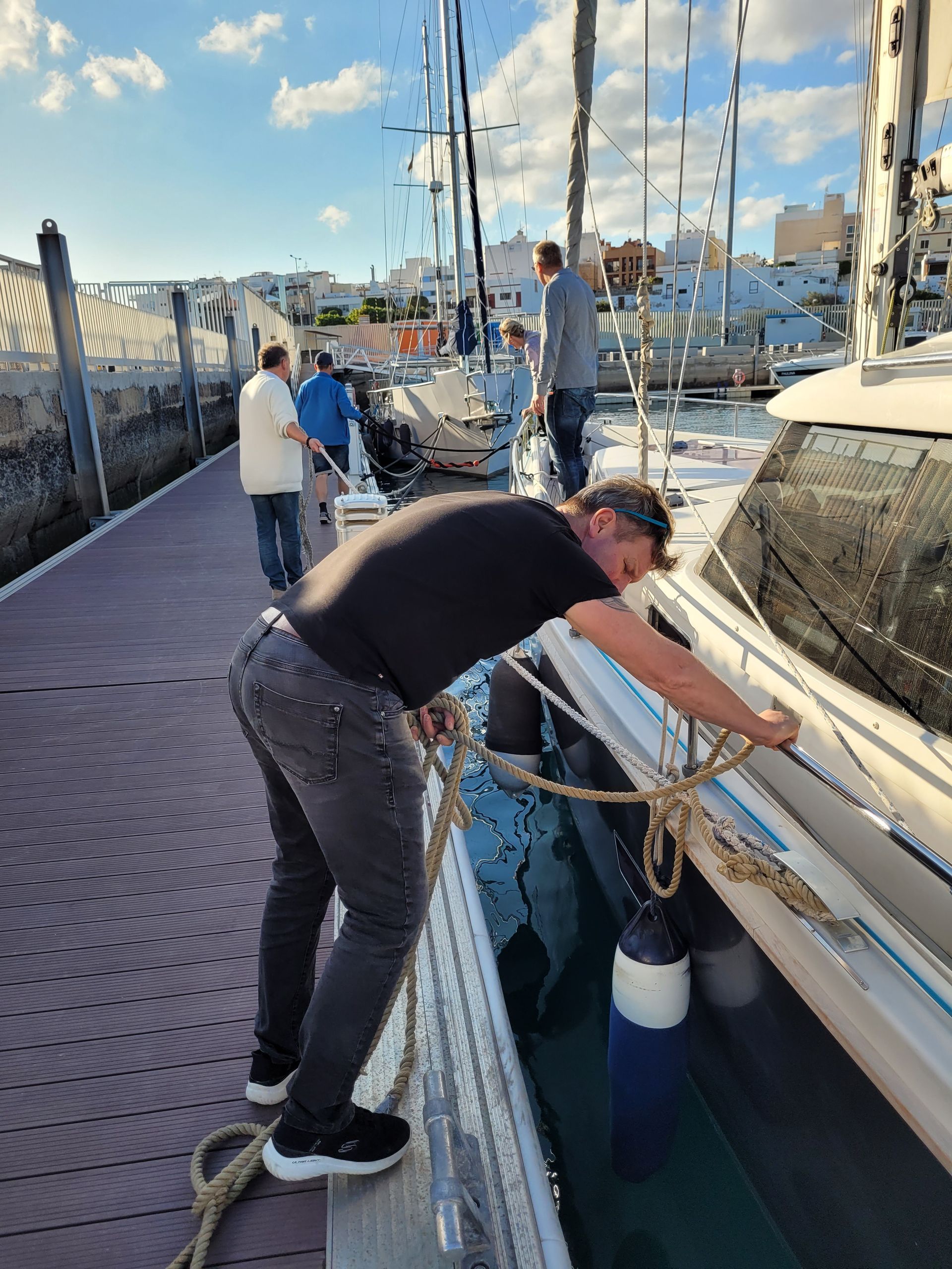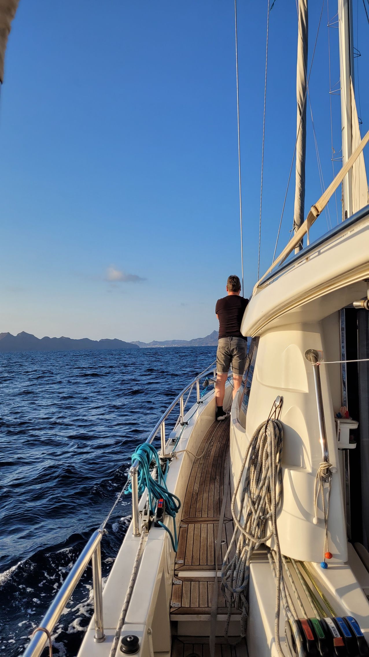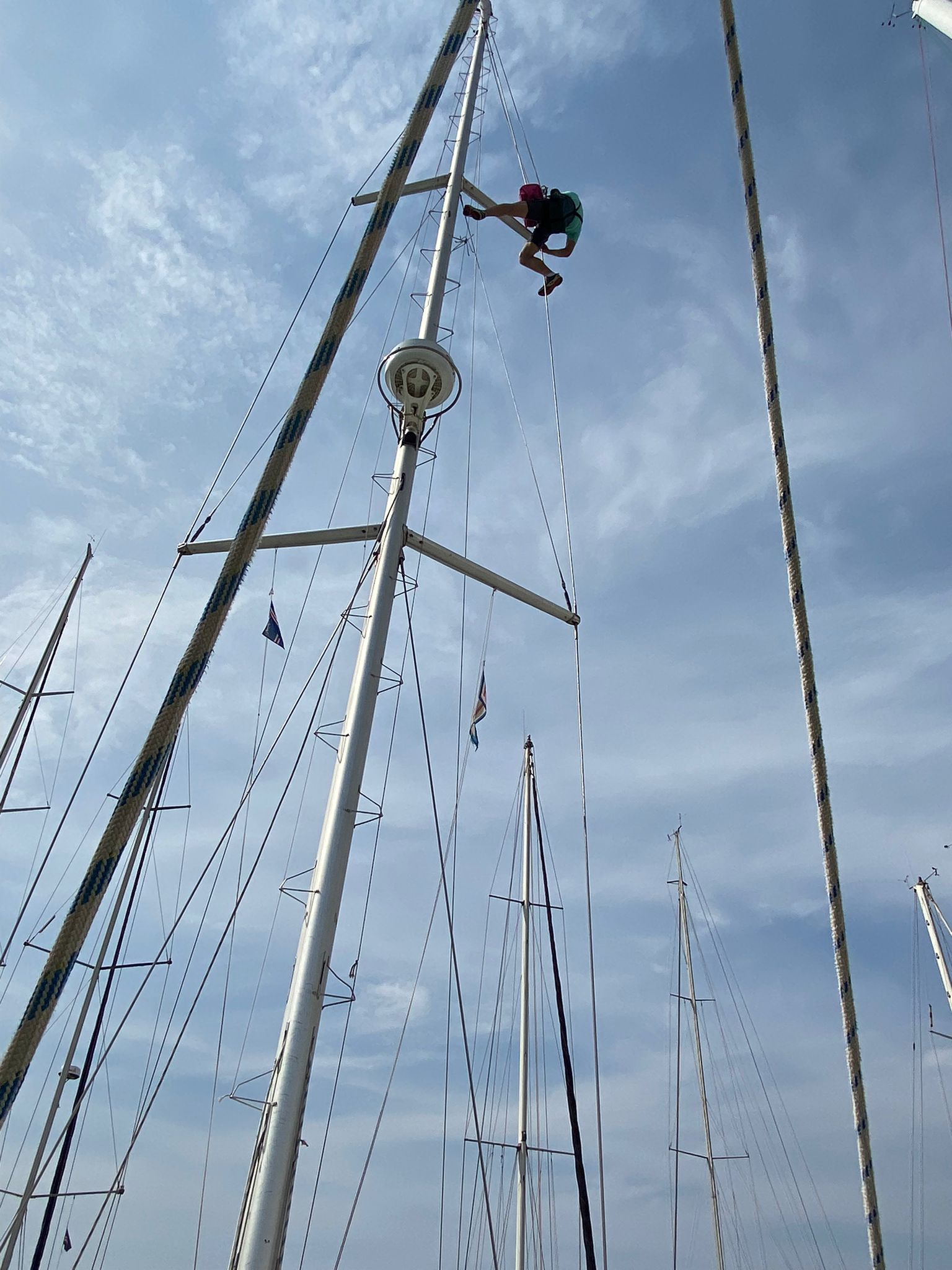 Sehr ruhige Nacht, kein Klappern der Wanten, keine Motorengeräusche, kein Herumgegrölle. Alle haben gut geschlafen. Morgens gehen Kerstin und Tom zum Einkaufen, holen frische Brötchen und checken weitere Einkaufsmöglichkeiten. Nach dem Frühstück im Cockpit, gibt es größere Reparaturarbeiten, Reini tauscht den ausgeschlagenen Schubstangenkopf am Lenkgetriebe aus. Gernot geht wieder in den Mast um den Radarreflektor und Trittstufen befestigen. Während der Aktion sorgt unser französischer Nachbar beim Ablegen für ein Chaos, als er über unseren Bugfestmacher fährt und die Leine sich um seine Schraube wickelt. Gleichzeitig treibt er direkt quer auf uns zu. Als er wieder zurück in seine Box geht, gelingt es einem seiner Crewmitglieder unseren Festmacher von seiner Schraube zu befreien. Der 2. Ablegeversuch gelingt dann schließlich mit vereinten Kräften. Gernot, Heiko und Reini bauen einen Schwanenhals (Kabeldurchführung) auf Deck um, der beim Segeln etwas störte. Nach getaner Arbeit lädt der Skipper zu einem Getränk in der Marina-Kneipe ein.