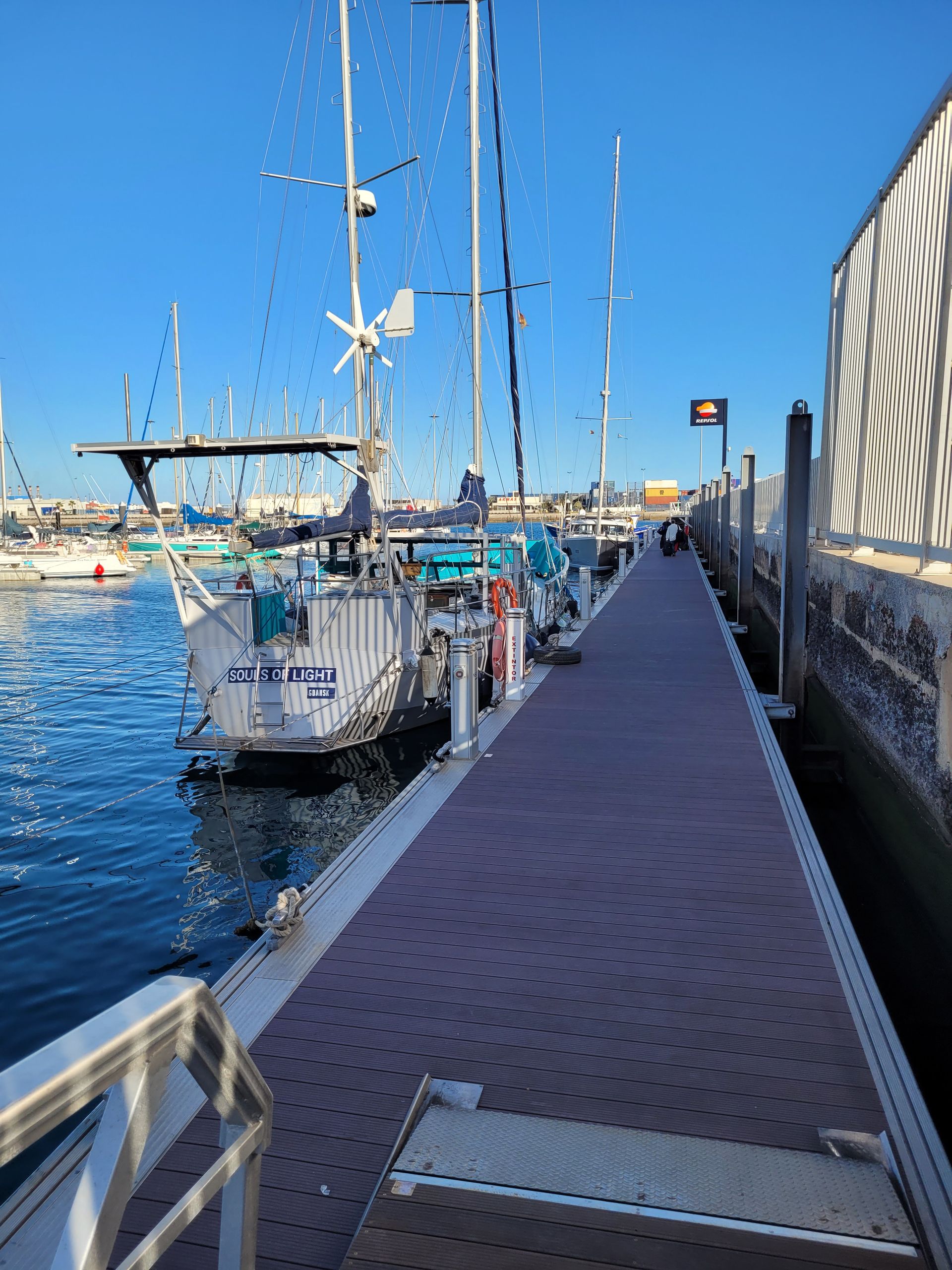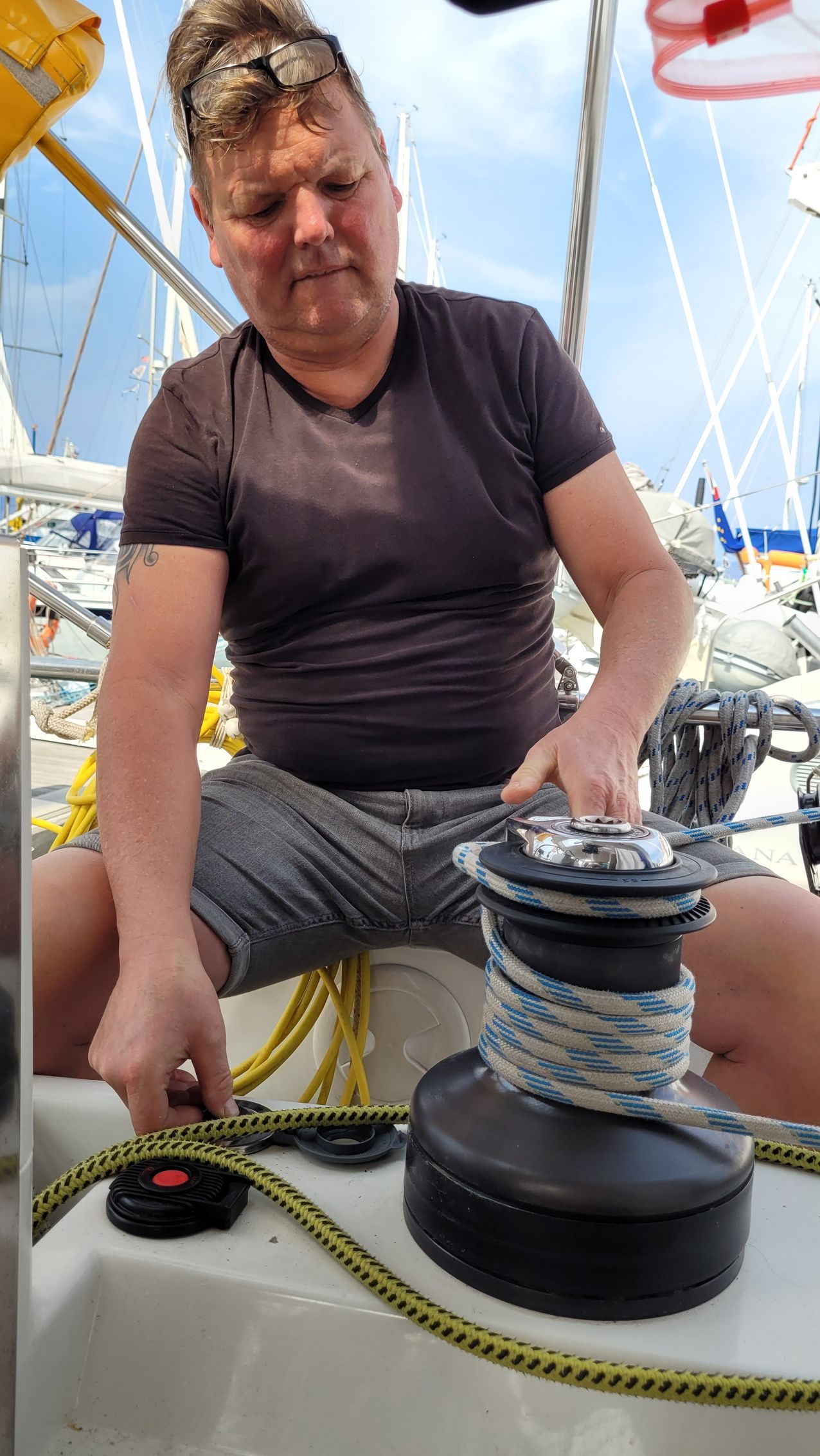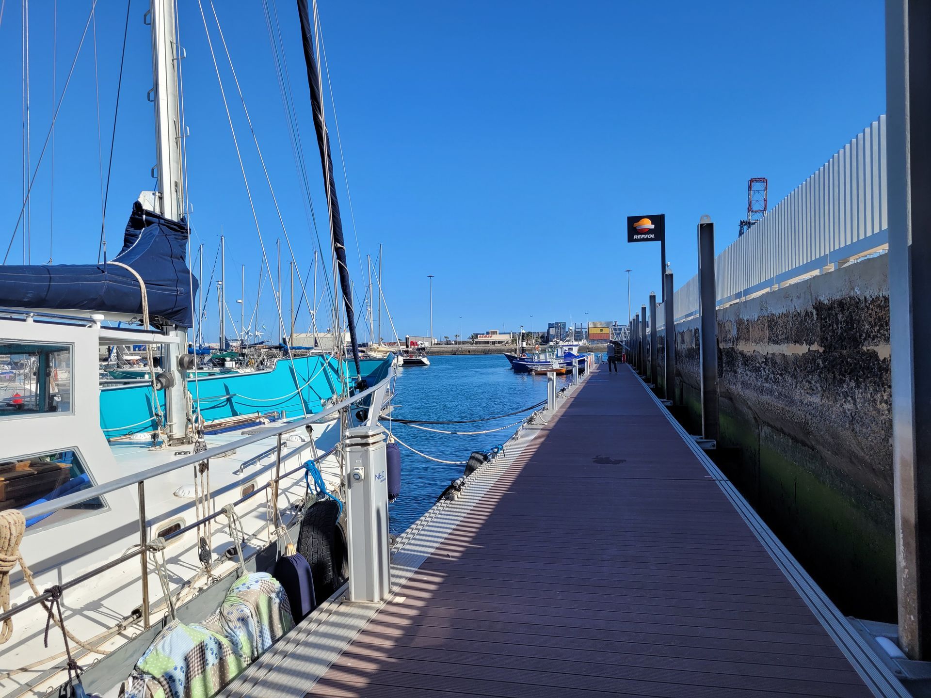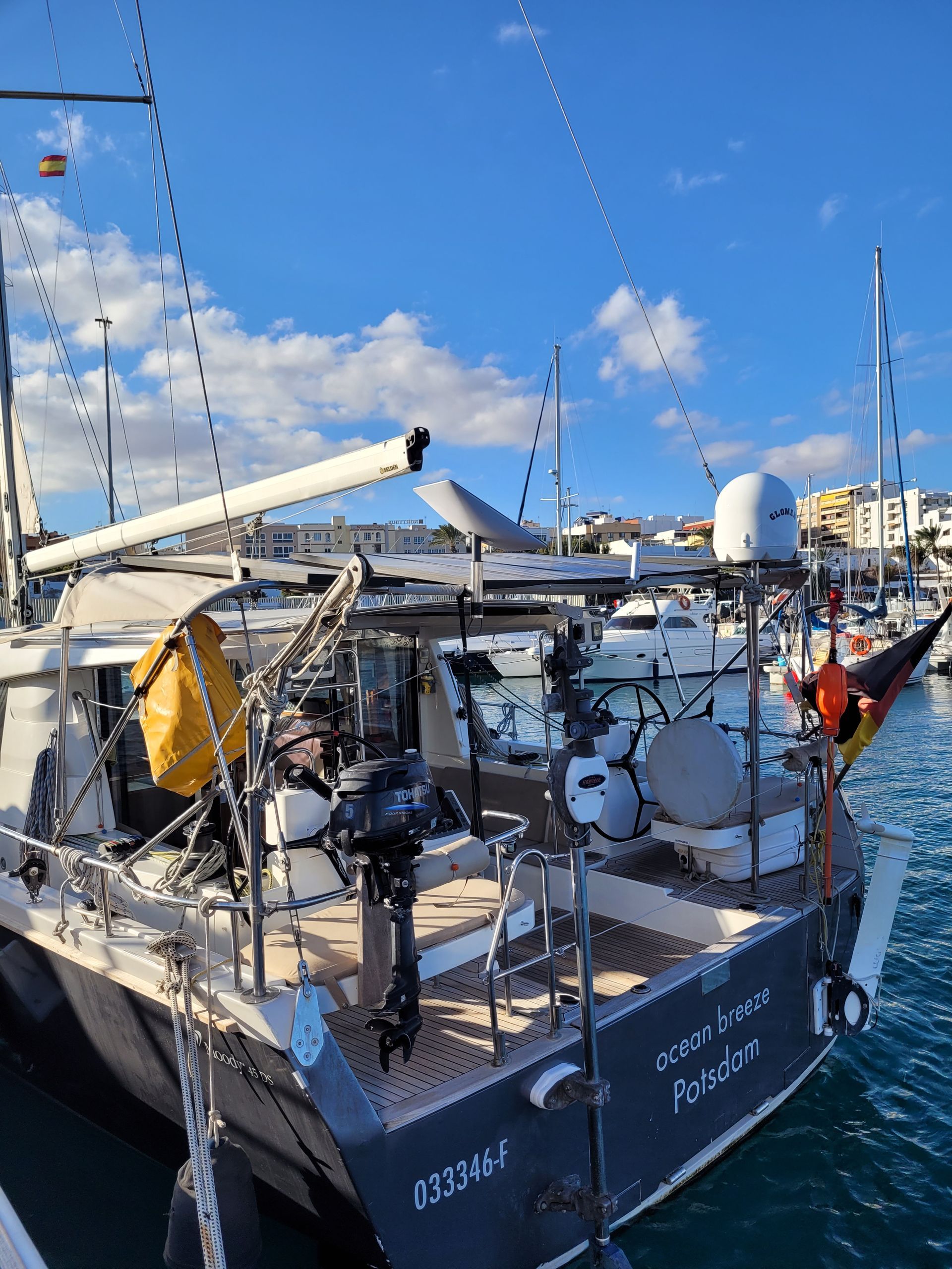 Sehr ruhige Nacht, kein Klappern der Wanten, keine Motorengeräusche, kein Herumgegrölle. Alle haben gut geschlafen. Morgens gehen Kerstin und Tom zum Einkaufen, holen frische Brötchen und checken weitere Einkaufsmöglichkeiten. Nach dem Frühstück im Cockpit, gibt es größere Reparaturarbeiten, Reini tauscht den ausgeschlagenen Schubstangenkopf am Lenkgetriebe aus. Gernot geht wieder in den Mast um den Radarreflektor und Trittstufen befestigen. Während der Aktion sorgt unser französischer Nachbar beim Ablegen für ein Chaos, als er über unseren Bugfestmacher fährt und die Leine sich um seine Schraube wickelt. Gleichzeitig treibt er direkt quer auf uns zu. Als er wieder zurück in seine Box geht, gelingt es einem seiner Crewmitglieder unseren Festmacher von seiner Schraube zu befreien. Der 2. Ablegeversuch gelingt dann schließlich mit vereinten Kräften. Gernot, Heiko und Reini bauen einen Schwanenhals (Kabeldurchführung) auf Deck um, der beim Segeln etwas störte. Nach getaner Arbeit lädt der Skipper zu einem Getränk in der Marina-Kneipe ein.