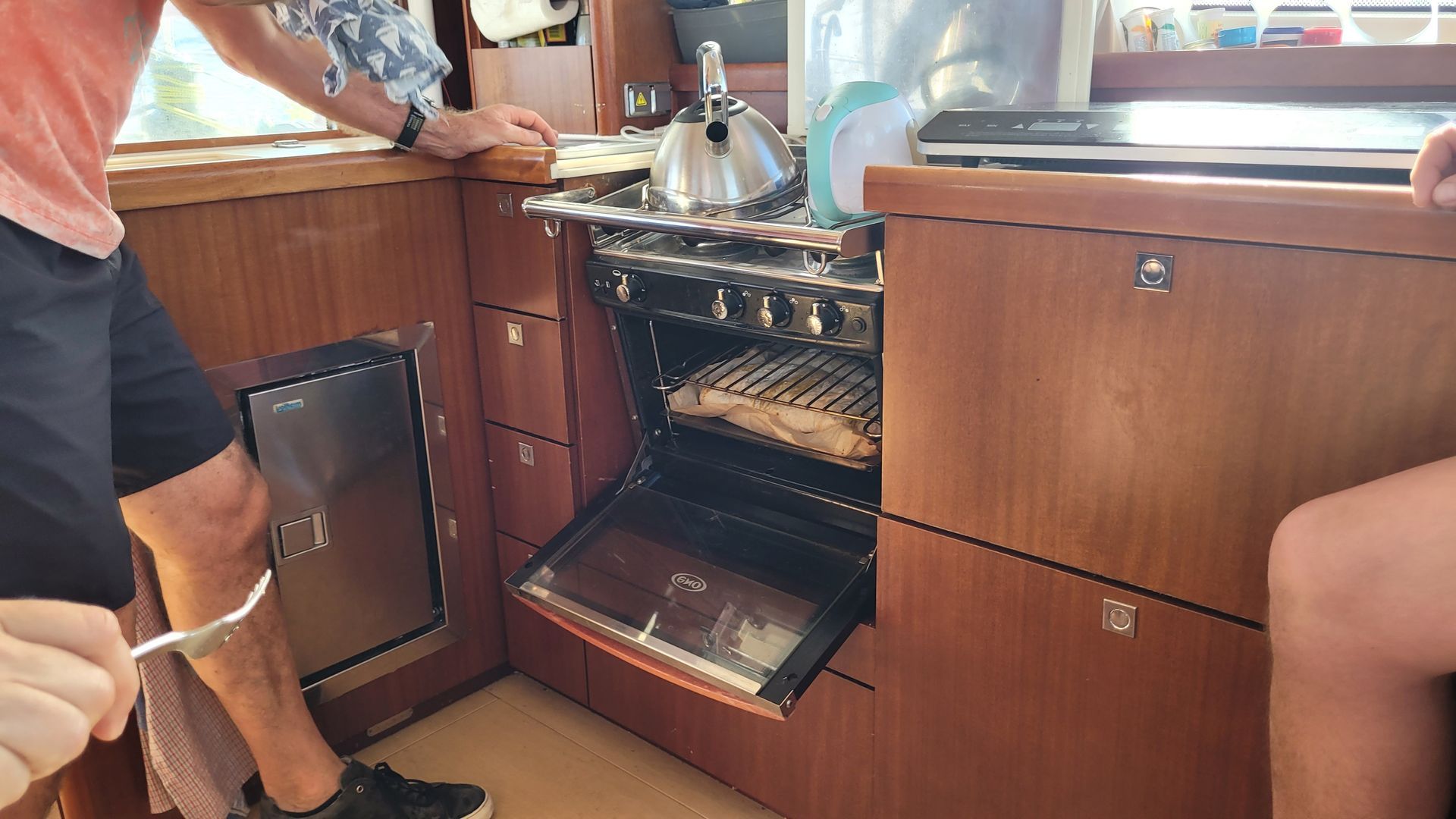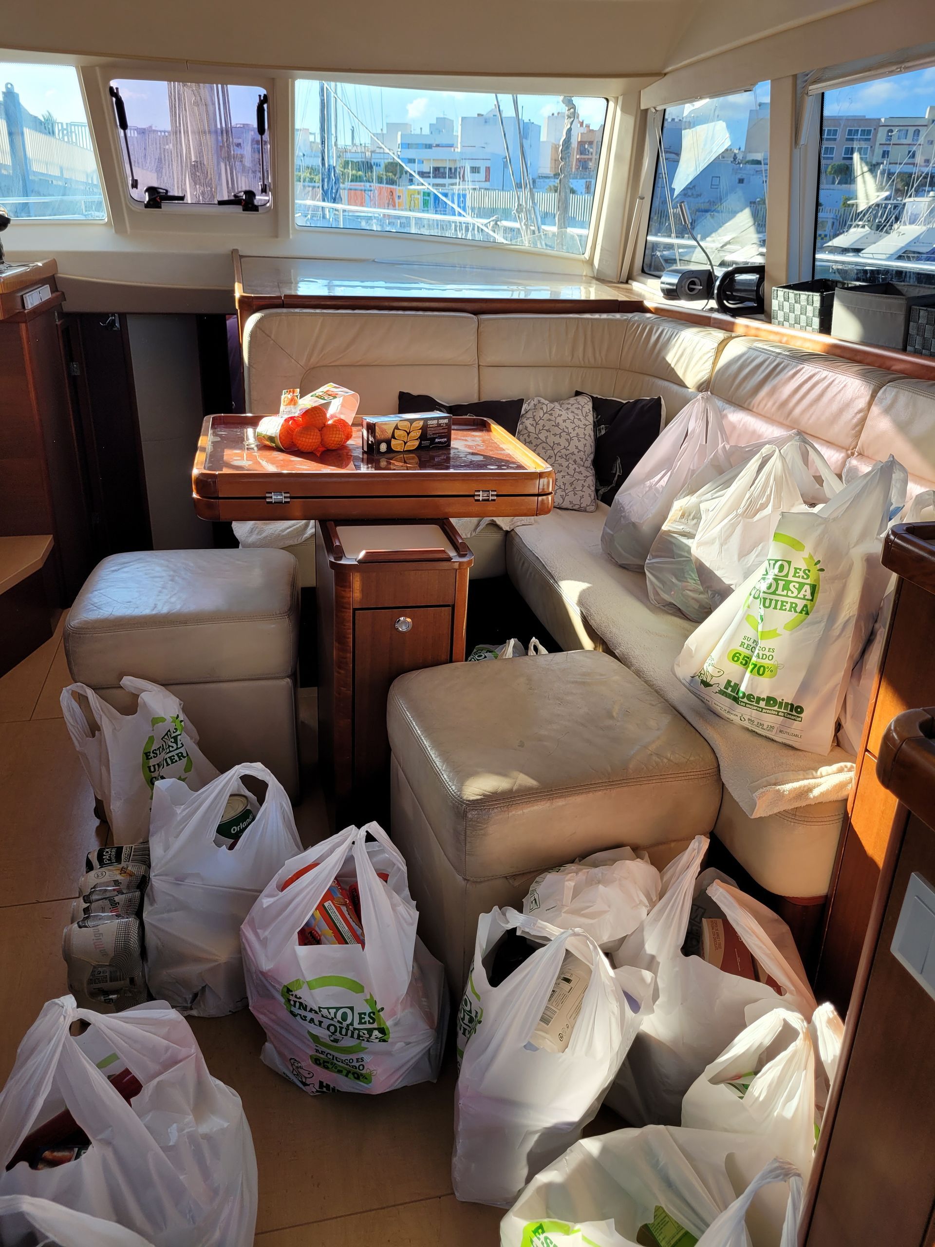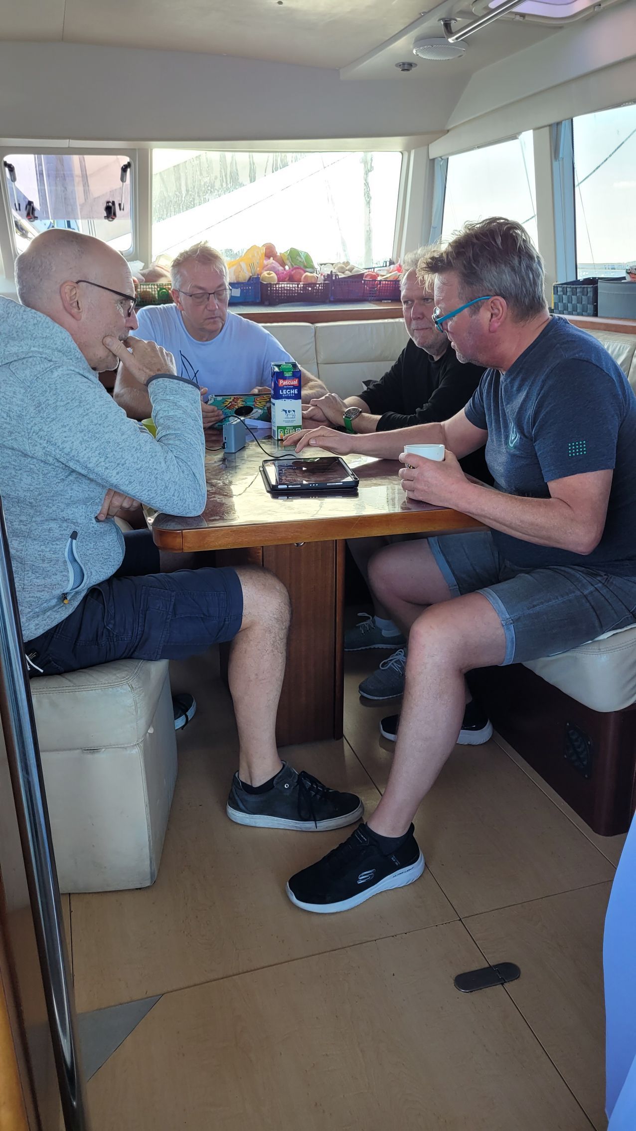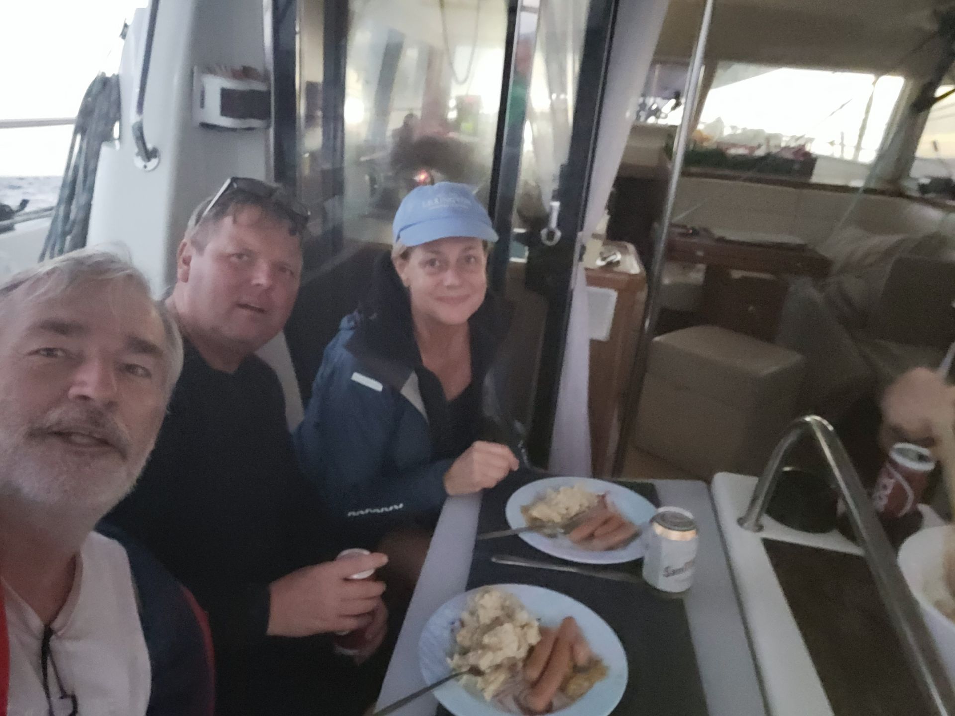 Anschließend wird der Salontisch besser befestigt. Frühstück findet wellenbedingt ambulant im Cockpit statt.