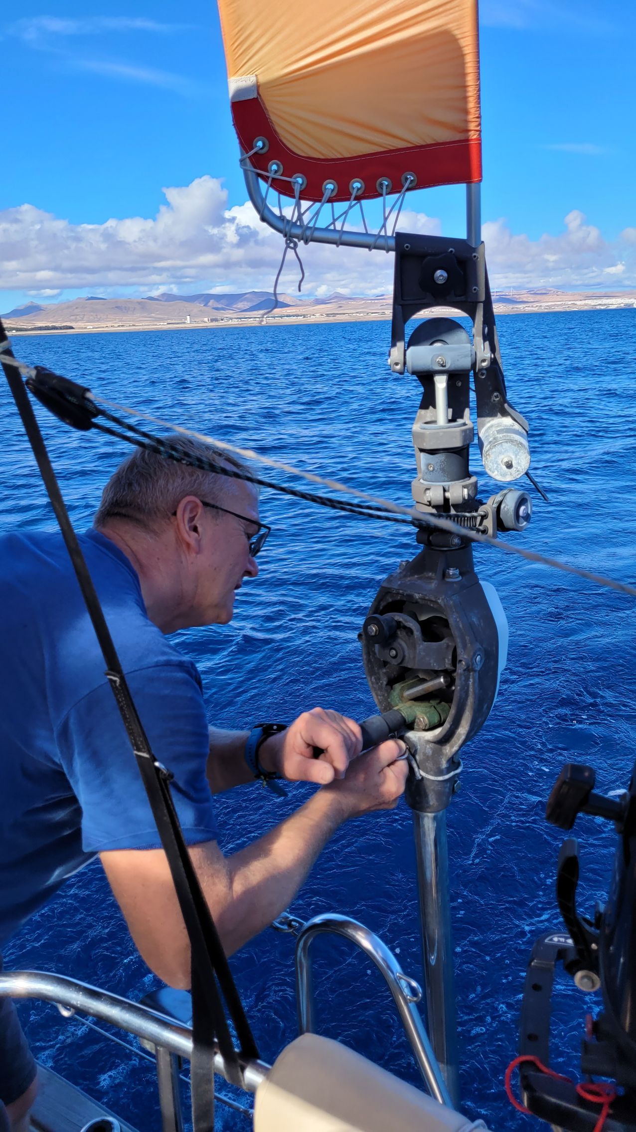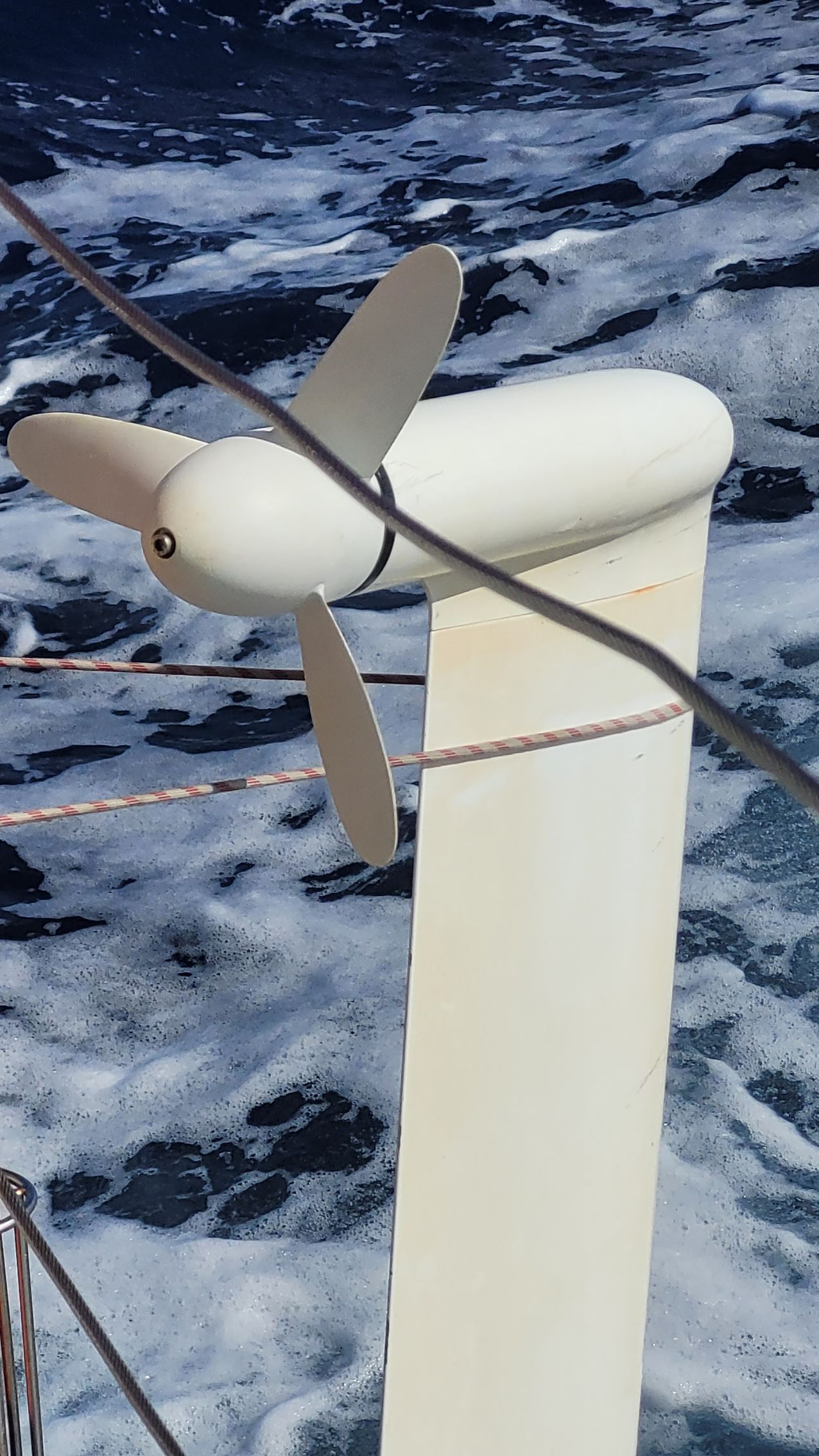 Der Hydro-Generator macht plötzlich laute Brummgeräusche. Bei der Überprüfung durch Gernot stellt sich heraus, dass das Teil heiß gelaufen und jetzt schwergängig ist. Es bleibt nur, dem Hydro-Generator aus dem Wasser zu nehmen. Das ist bitter, weil er ja unser wichtigster Stromversorger ist. Darauf werden dann Stromversorger wie Kartenplotter, Internet und Kühlschrank abgeschaltet.