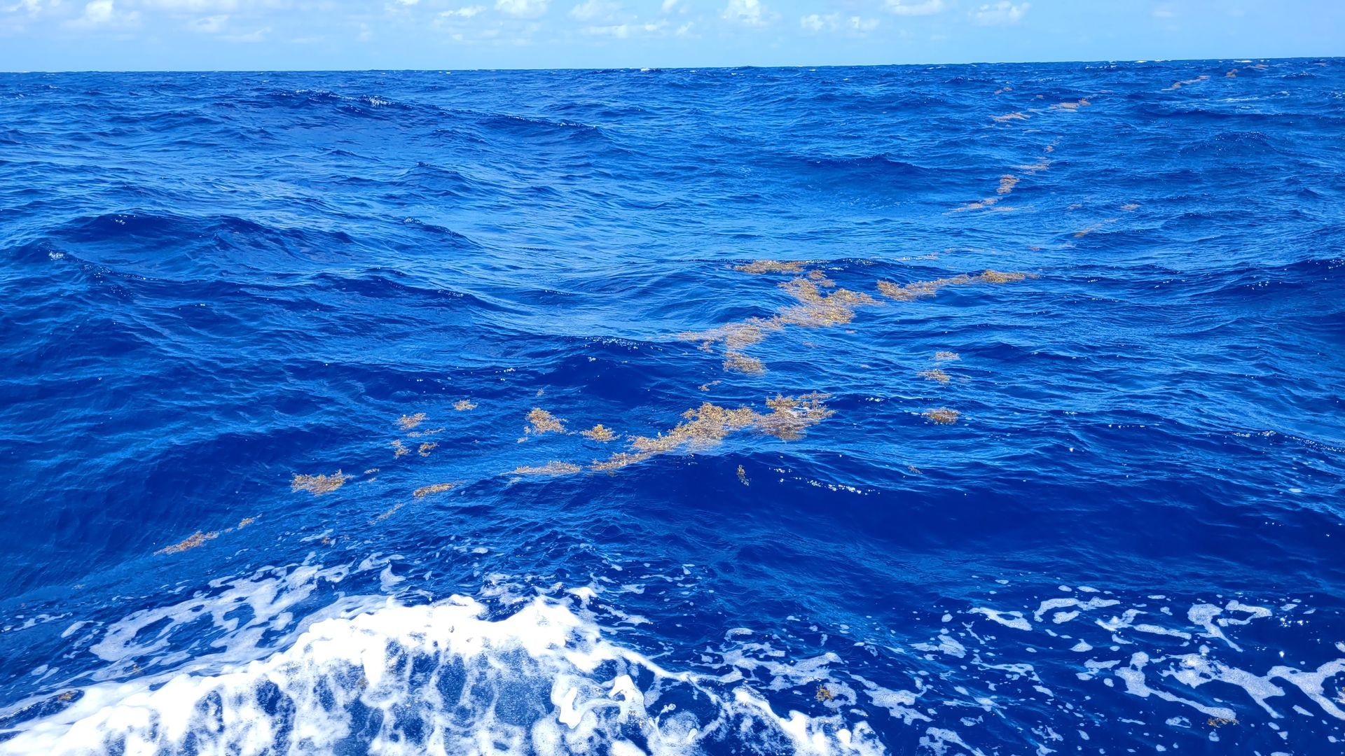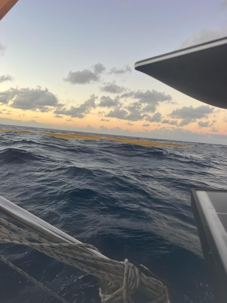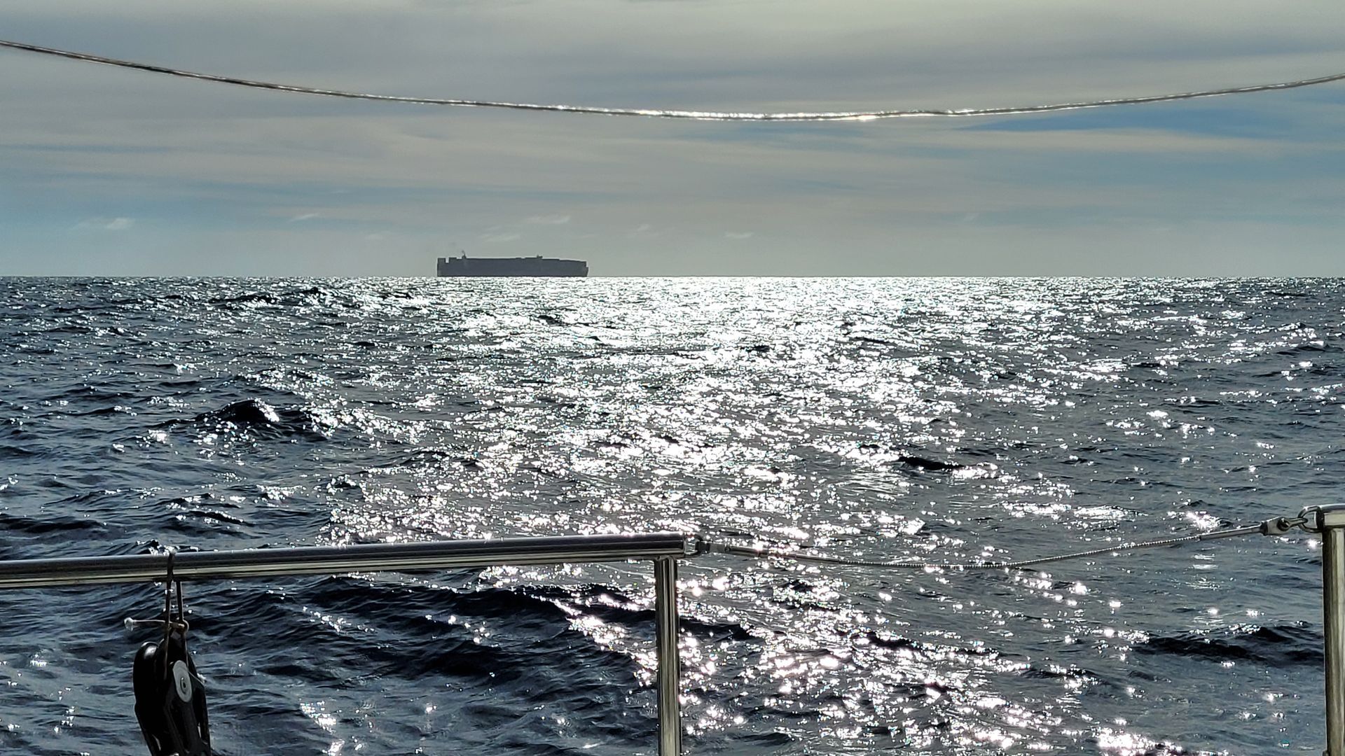 Morgens durchfahren wir einen großen Algenteppich und vor uns kreuzt ein großes Container-Schiff unseren Kurs. Der Wind ist gleichmäßiger geworden. Wir fahren mit ausgebaumter Genua und Großsegel als Schmetterling weiter nach Westen.