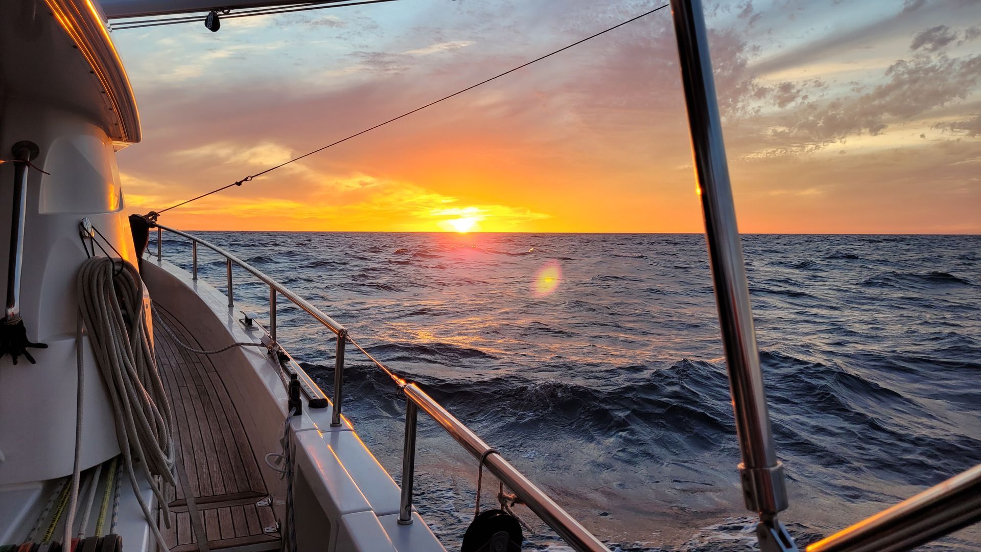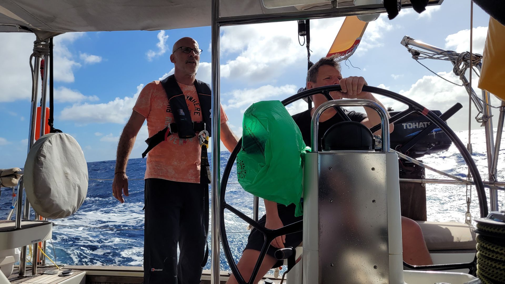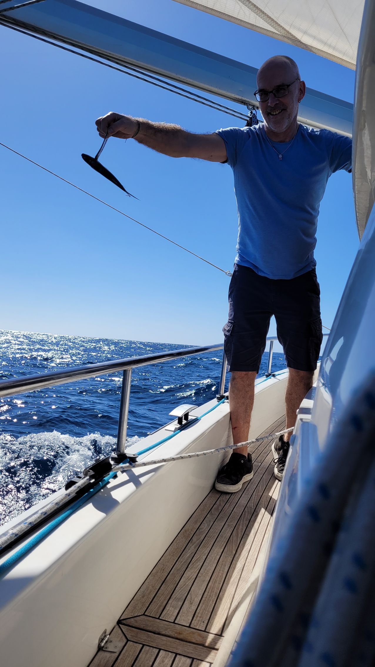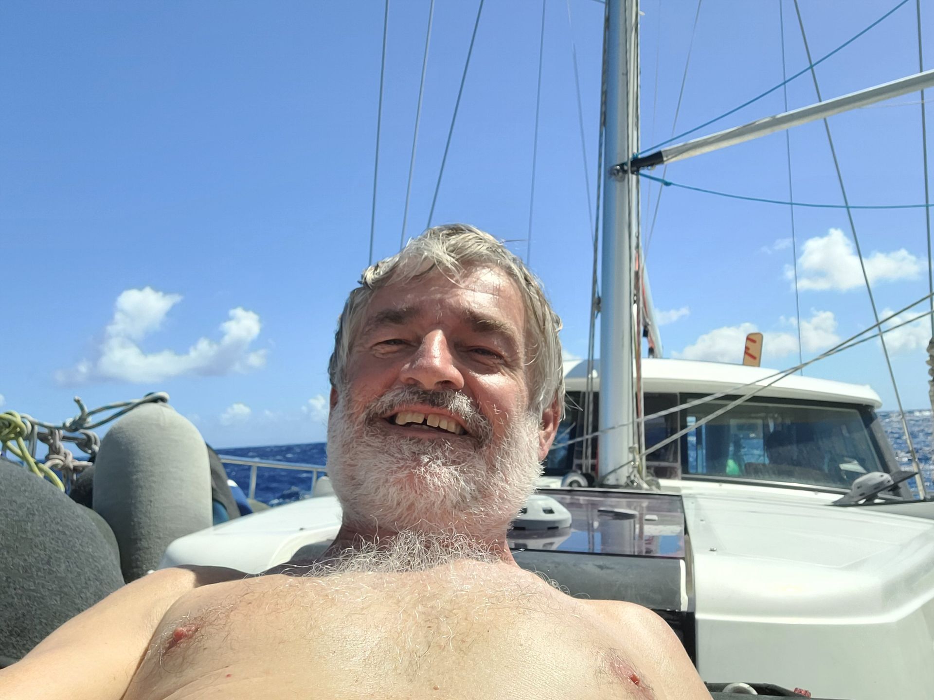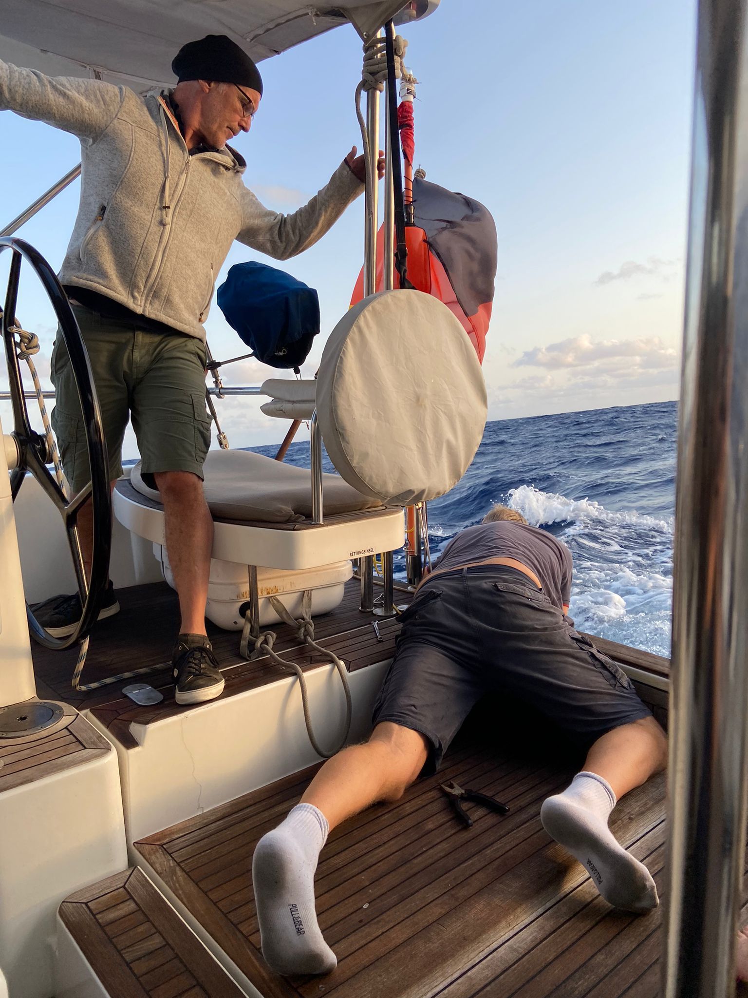 Am Morgen wieder wolkenloser Himmel und guter Segelwind. Die Segel stehen wie am Vortag. Gernot und Heiko finden 2 fliegende Fische, haben sich leider verflogen. Nach dem Frühstück Reparaturarbeiten durch Gernot und Heiko, um nächtliches Knarren abzustellen. Heiko als Akustik-Ingenieur ist in seinem Element.