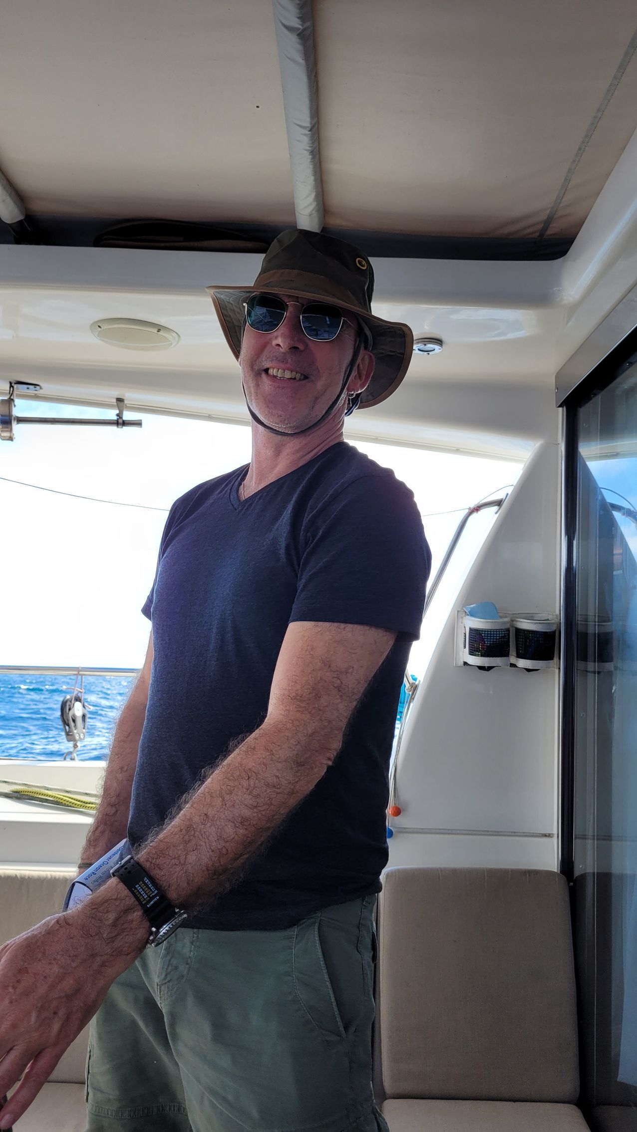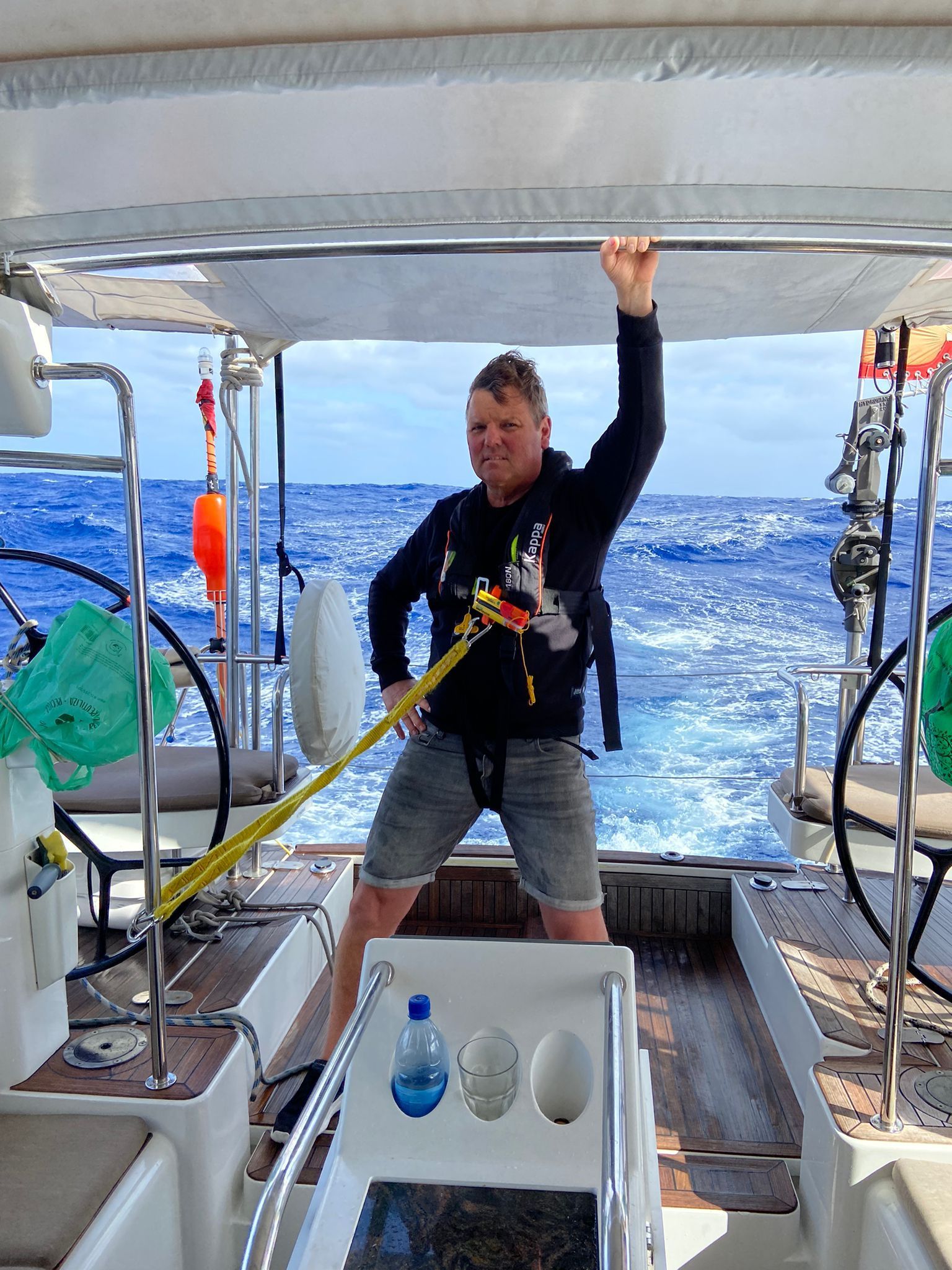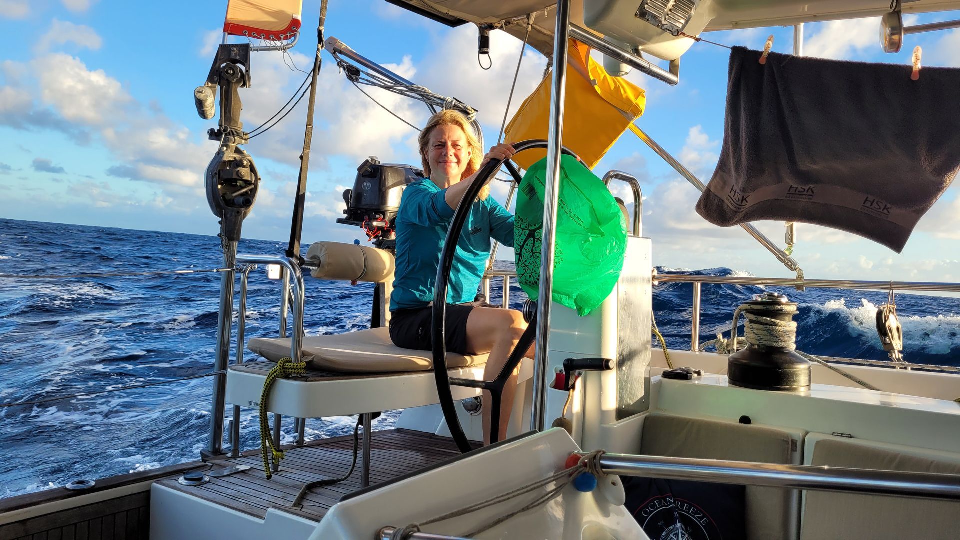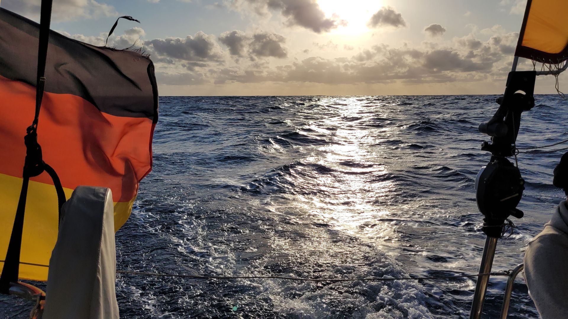 Wieder eine sehr entspannte Nachtwache. Das Boot liegt immer noch stabil auf TWA 180° (True Wind Angle=Wahrer Wind-Kurs). Ein faszinierendes Meeresleuchten entsteht in unseren Wellen, ist aber leider schwer zu fotografieren. Meeresleuchten entsteht nach einem sonnigen Tag, wenn ruhiges Wasser im Dunkeln aufgewirbelt wird. Es wird von den Meeresleucht-Tierchen ähnlich Glühwürmchen erzeugt. Der Morgen startet ebenso entspannt. Zeit für eine Katzenwäsche nach Rezept von Winfried Kretschmann mit Waschlappen ;-)