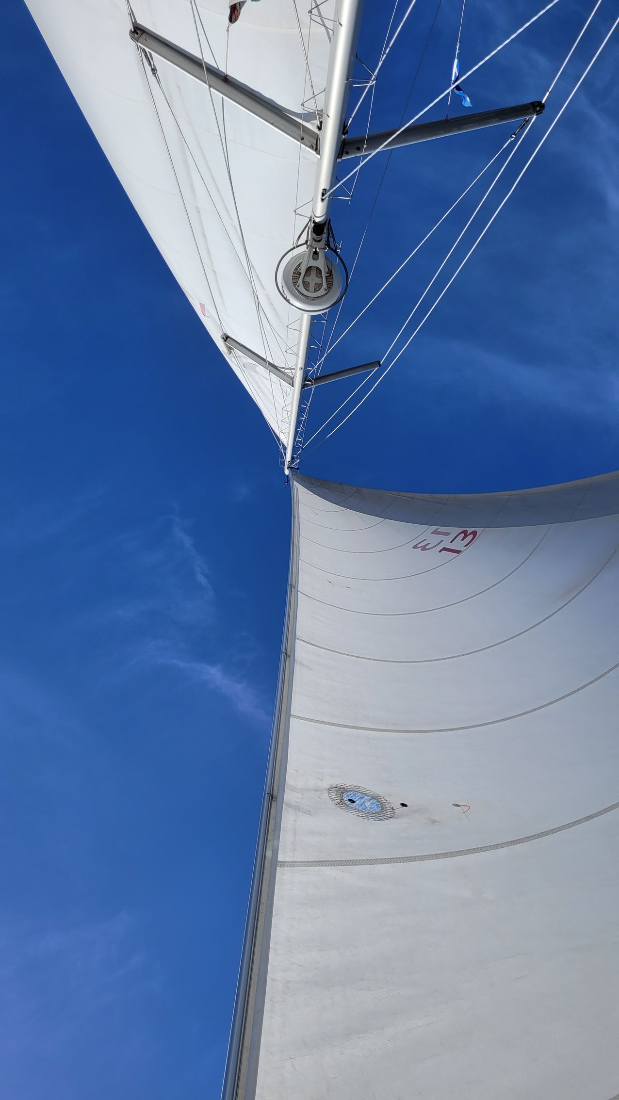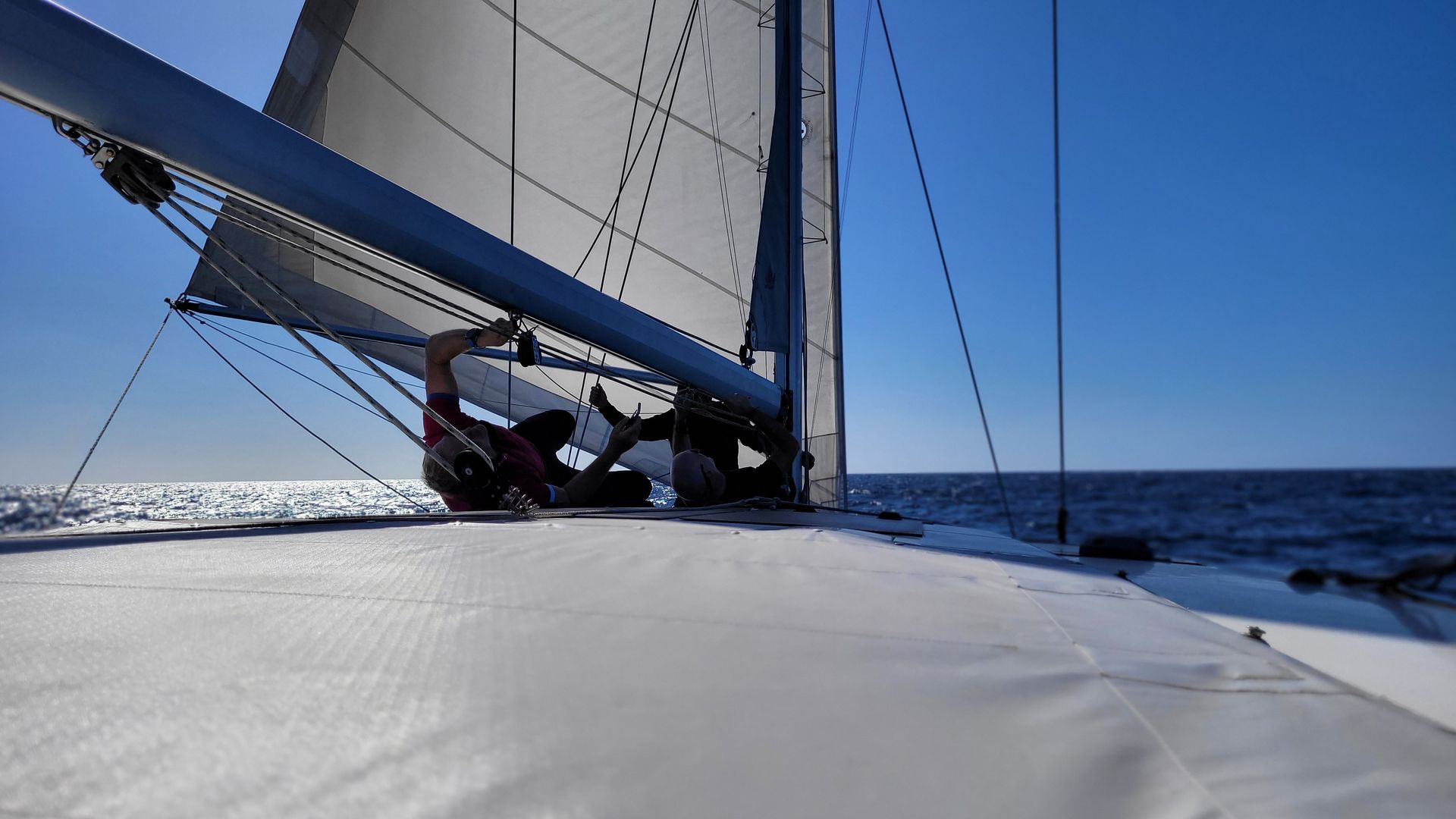 Morgens wird festgestellt, dass die Großschot dabei ist, sich aufzulösen. Gernot und Heiko haben die Leine dann ausgetauscht. Später wurde das Großsegel dann auf Steuerbordbug für Schmetterling umgelegt. Vorsorglich wird noch ein anderer Umlenkblock ausgetauscht.