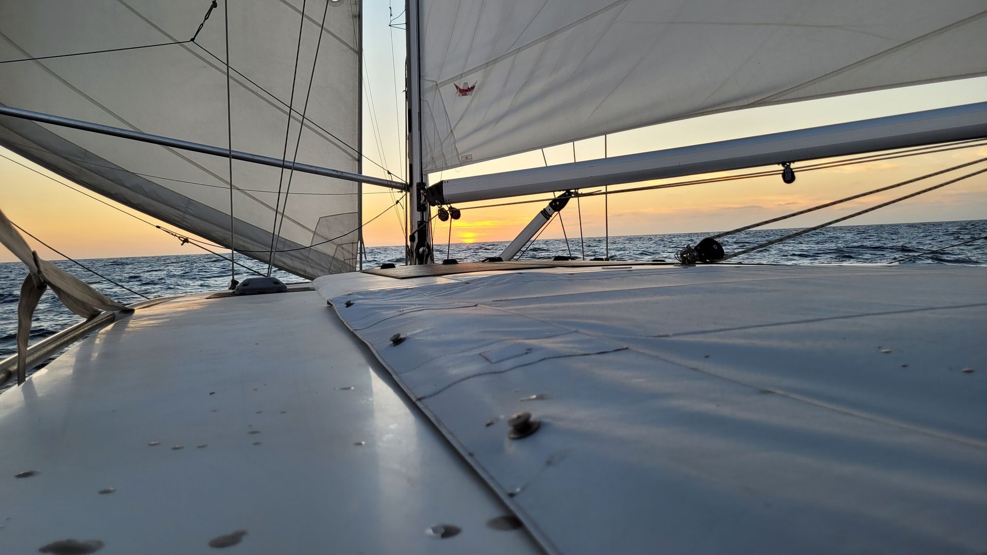 Da wir keine Wolke am Himmel haben, sind die Batterien voll. Tom nutzt die Gelegenheit ein fantastisches Chilli con Carne zu zaubern, das abends aufgetischt wird. Zuvor wird der Genacker geborgen, das Großsegel auf Backbordbug umgelegt und die Genua auf Steuerbordbug aufgezogen. Mit dieser Schmetterlingsbesegelung und dem moderaten Wind von 10-16 kn liegt das Boot optimal stabil auf Kurs 222°. Diese Art zu segeln wird von Seglern gerne als Pantoffelsegeln verspottet, ist aber bei diesem Wind und unserem Ziel gerade richtig.