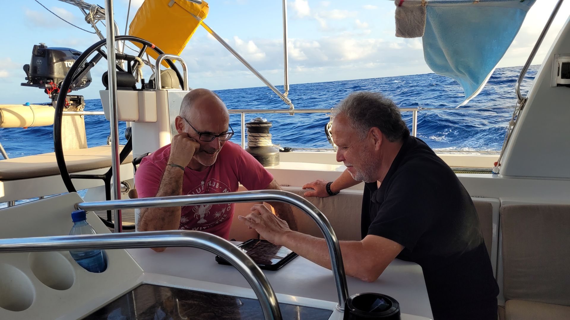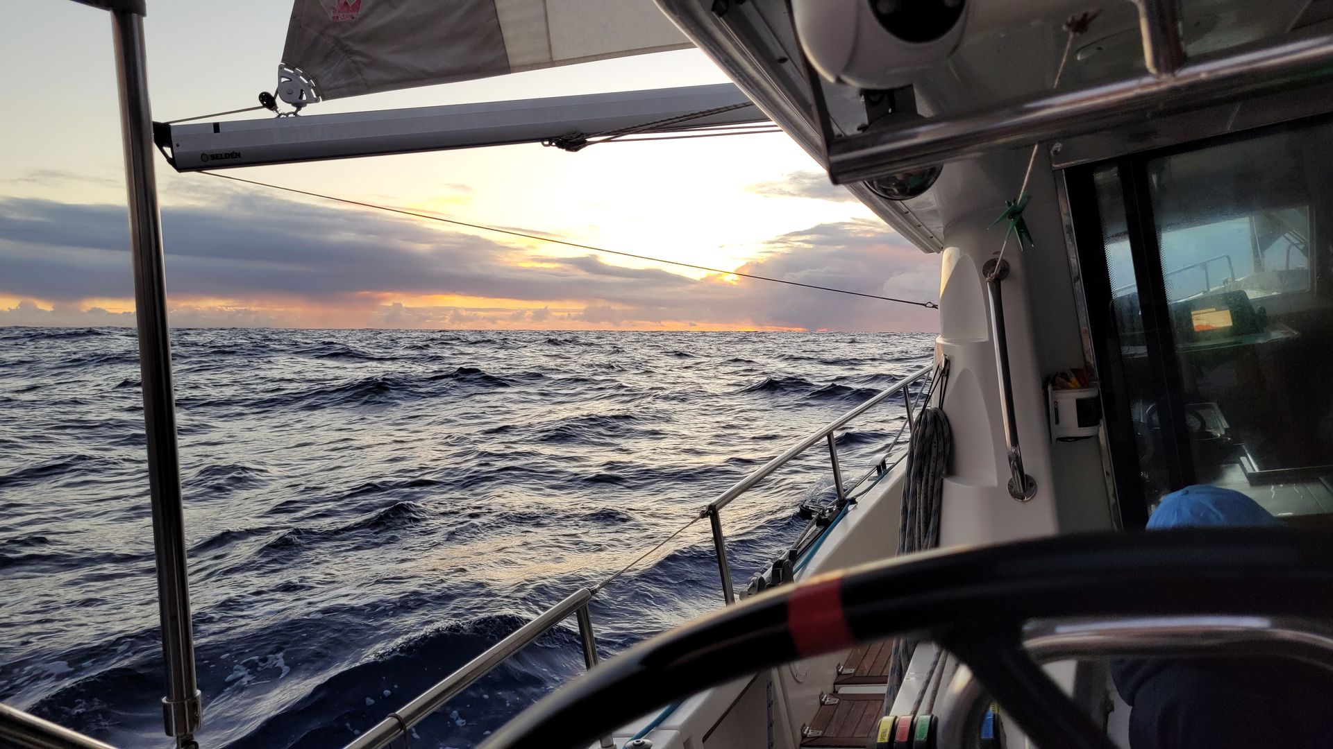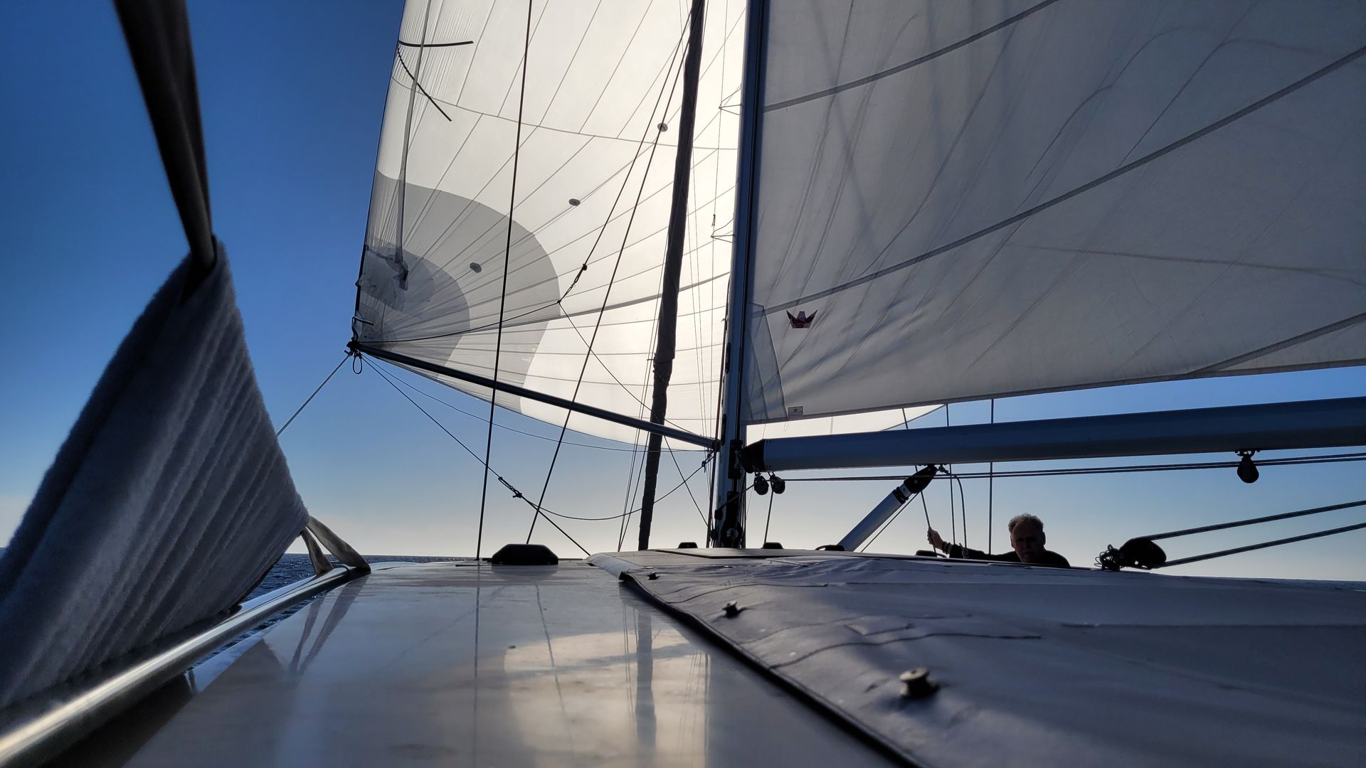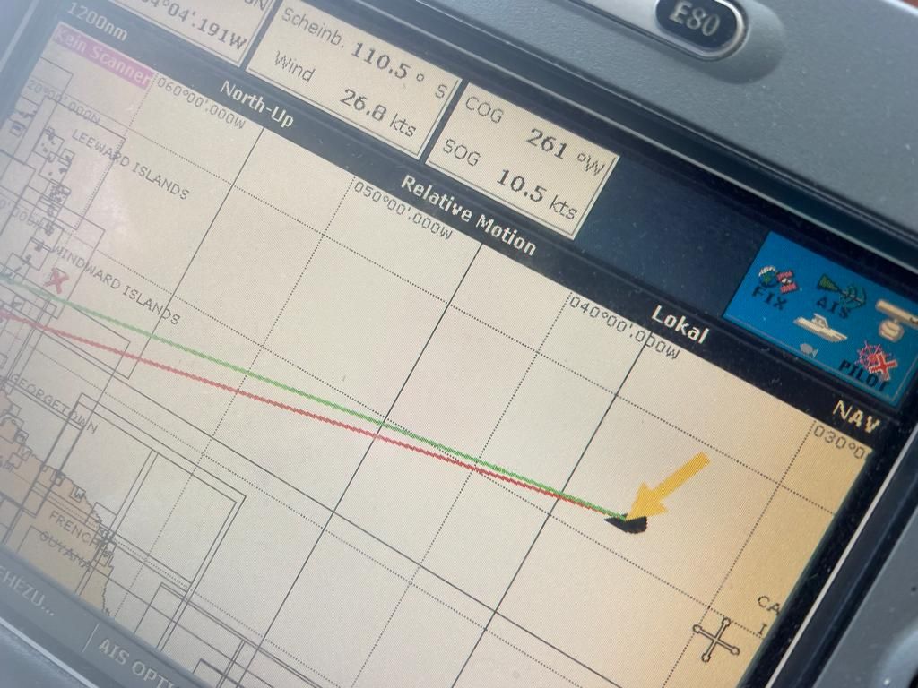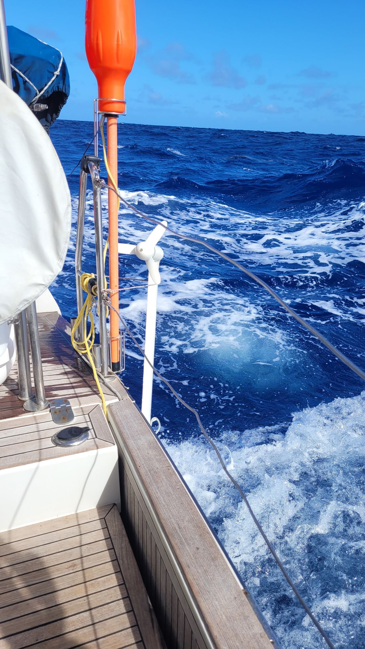 Gernot schaltet den Inverter wieder ein. Dieser wurden abends zum Stromsparen abgeschaltet. Der Inverter wandelt den 12 Volt Batteriestrom in 220 Volt Wechselstrom um und versorgt damit die 220V-Geräte wie Starllink(Internet). Es dauert aber ca. eine halbe Stunde bis Starllink wieder online ist. Danach Durchsprache der nächtlichen Manöver. Gernot und Heiko versuchen die Stellung von Segel und Steuer zu optimieren. Es gilt, maximale Geschwindigkeit bei minimaler Kursabweichung zu erzielen, ohne dem Wellengang unnötig ausgesetzt zu sein. In der Nacht mussten wir doch mit Kursen um 190° den optimalen Kurs verlassen. Laut Gernots Berechnung fahren wir dadurch aber nur 3 sm Umweg.