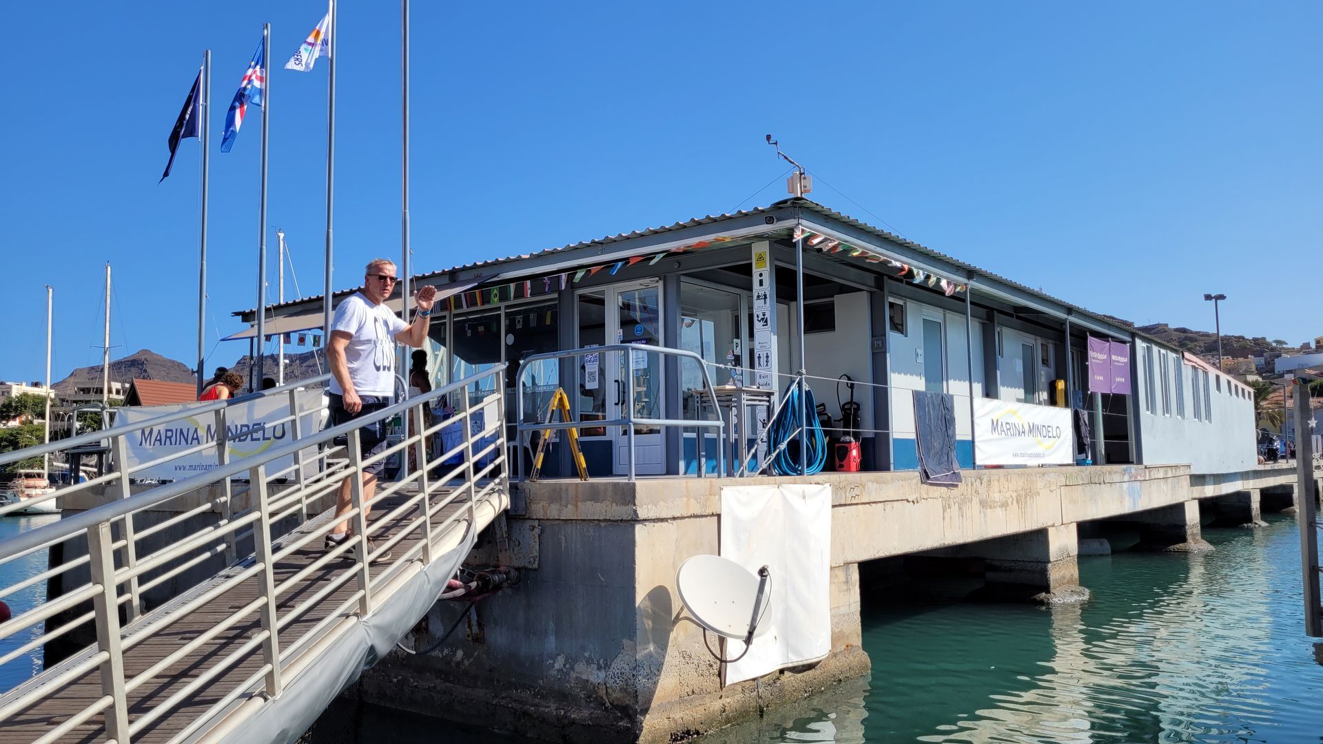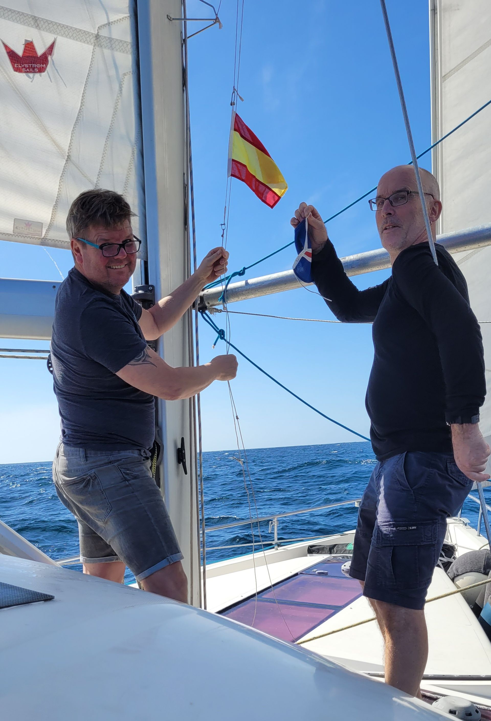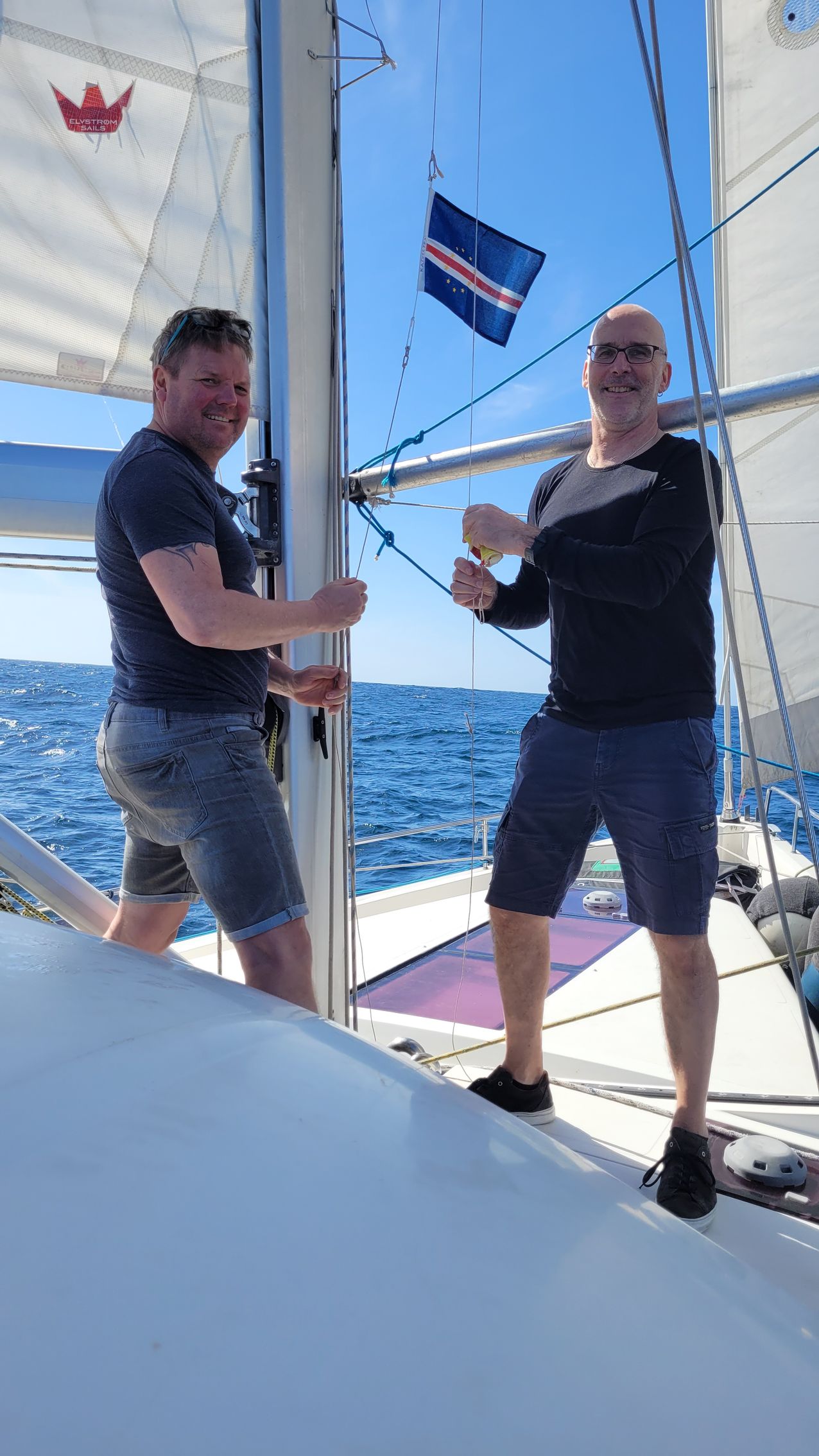 Mittags: Gastflaggen-Wechsel durch Reini und Heiko. Die spanische Flagge wird eingeholt und die Flagge der Kapverden gesetzt. Die 10 Sterne symbolisieren die 10 Inseln der Kapverden.