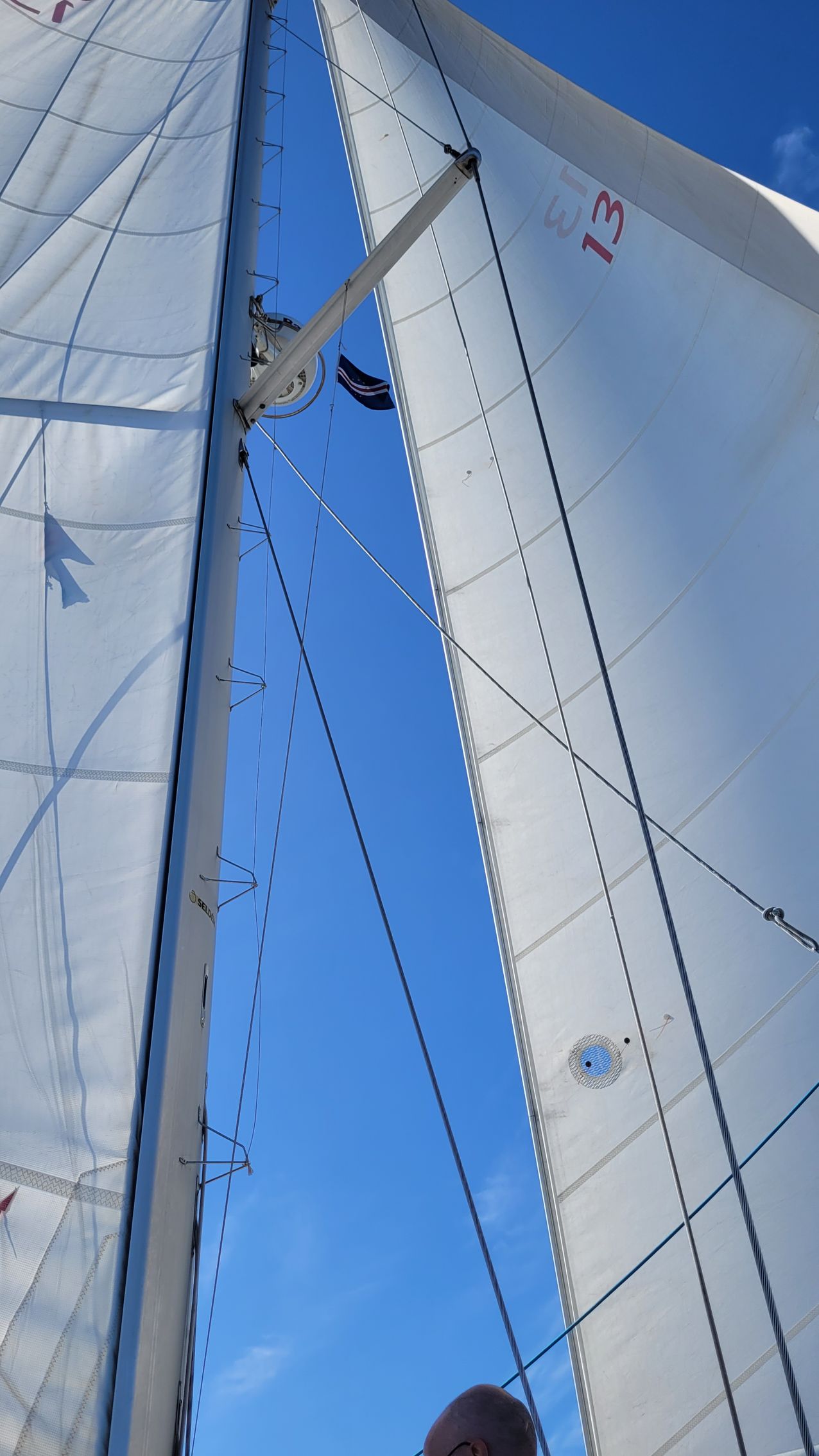 Habe nachts durch Steuerungsfehler ein Malheur provoziert, das von Gernot, Reini, und Heiko souverän gelöst wurde. Ab sofort wird mit Bullenstander gefahren, das bedeutet der Großbaum des Großsegels wird fixiert, damit er bei Seegang oder Änderungen der Windrichtung nicht auf die andere Seite schlagen kann.