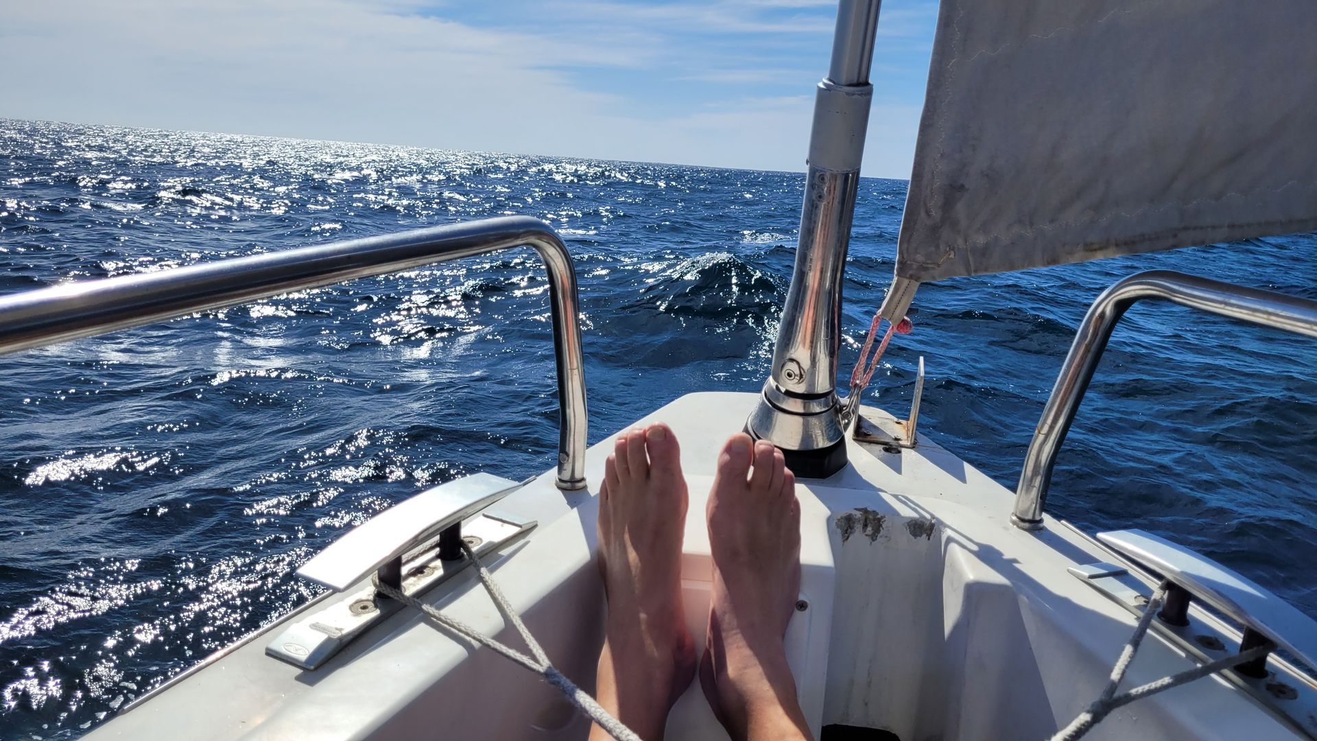 Der Tag beginnt für mich mit einer netten Aufforderung vom Skipper zum Duschen in seiner Käpitänsdusche. Sehr schöne Erfahrung, warmes Wasser, einfach zu bedienen, schick! In der Zwischenzeit hat Tom Frühstück vorbereitet, toll. Wir rauschen weiter mit 6 - 7,5 kn bei moderaten Winden von 12- 18 kn achterlich (genau von hinten) bis raumschots (schräg von hinten). Die Segel stehen als Schmetterling(Segel beidseitig rechts und links) oder auf Steuerbordbug(rechts). Grundkurs weiterhin 222° nach Mindelo auf St.Vicente/Kapverden.