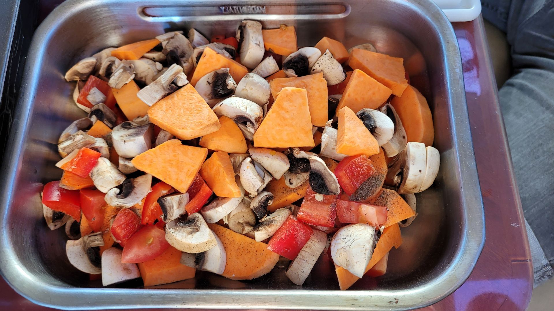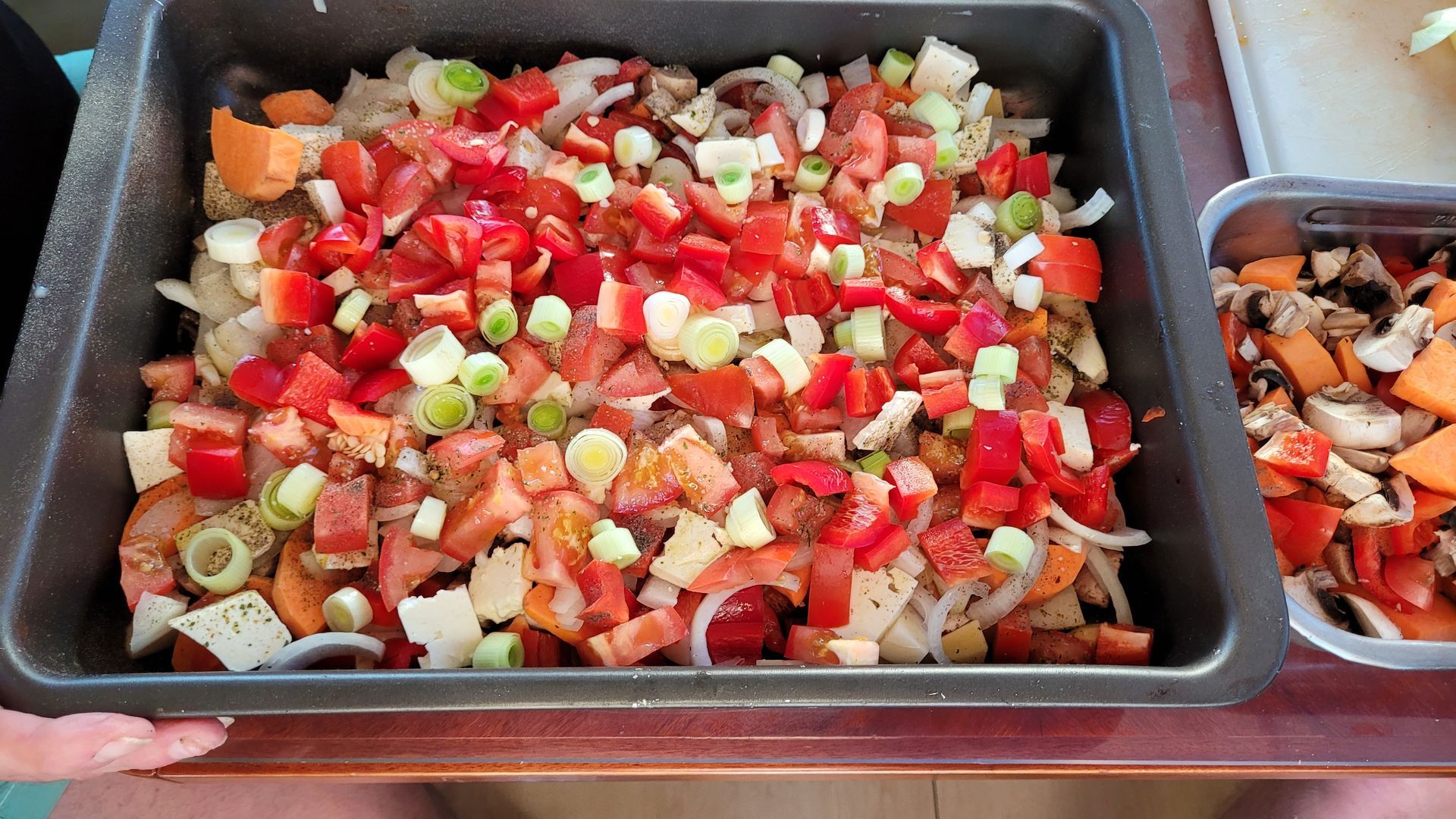 Tom und Reini zaubern heute einen Gemüseauflauf aus Süßkartoffeln, Kartoffeln, Champignons, Tomaten, Paprika, viel Knoblauch, Feta, Olivenöl, div. Gewürze. Am Schluß alles schön mit Käse überbacken. Sehr lecker, aber zuviel! Es bleibt genug für ein 2. Ma(h)l.