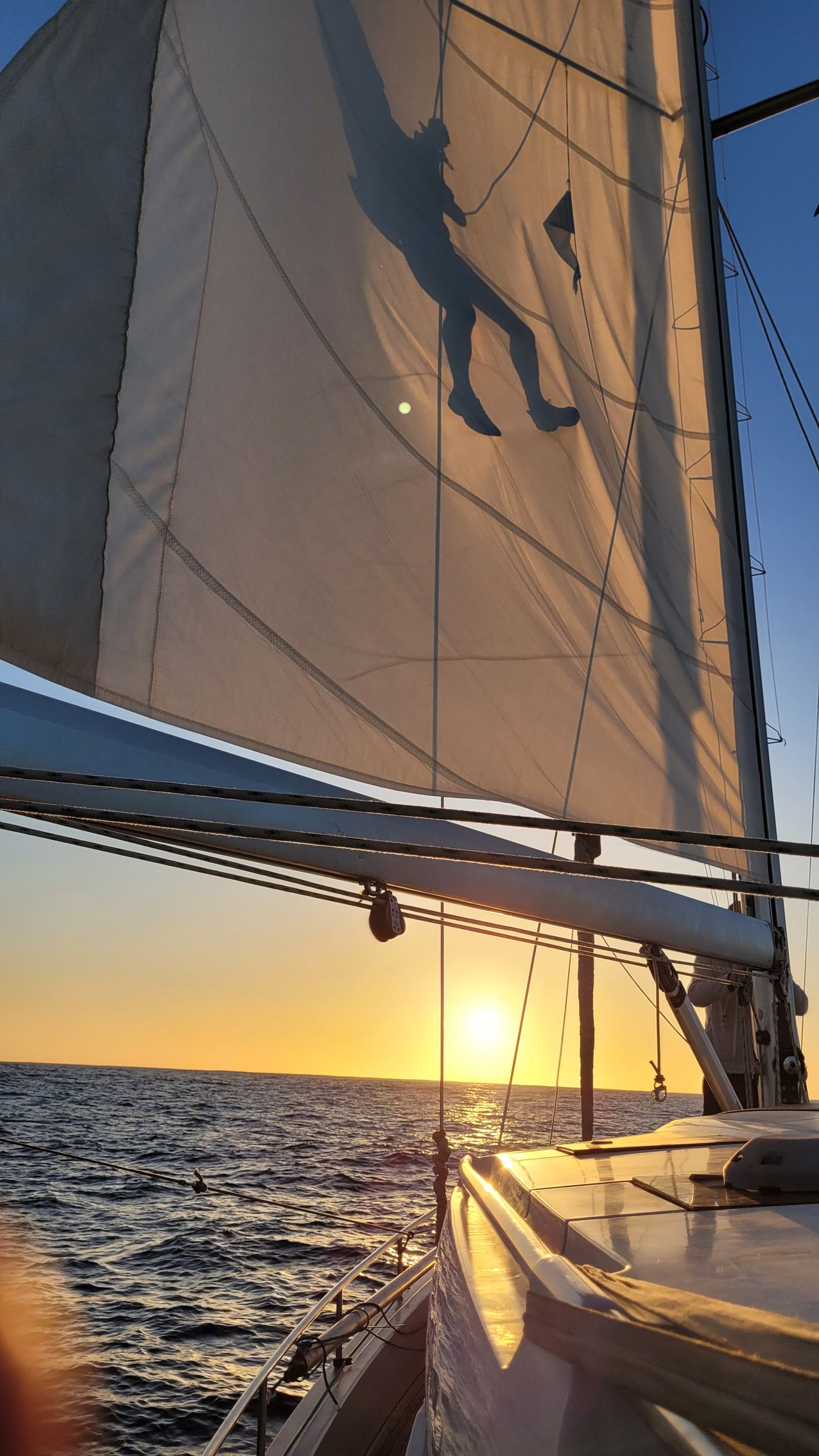 Wir fahren weiter mit Schmetterling, reffen aber das Großsegel um 13:30 Uhr ein, als der Wind böiger wird. Schon wieder Fototapeten-Sonnenuntergang. So kitschig und so toll!