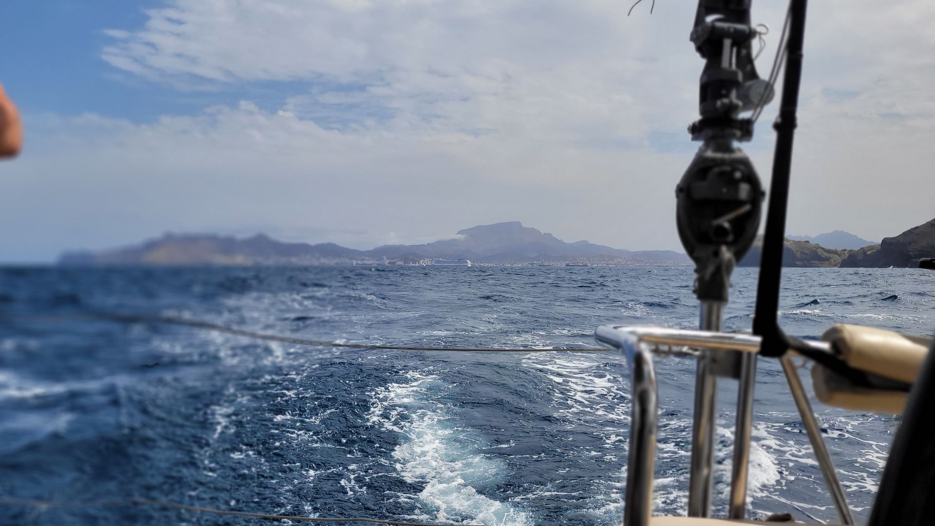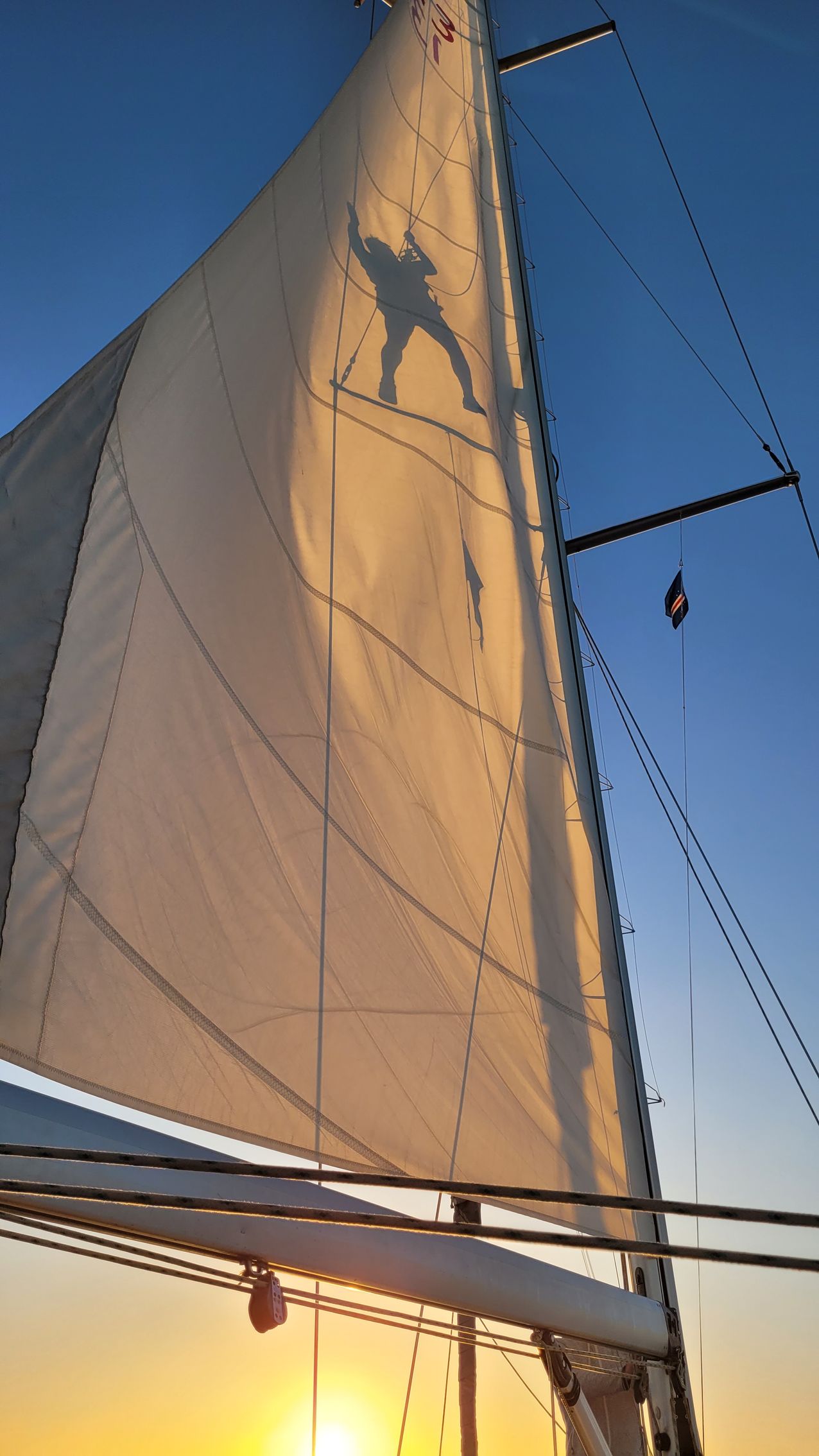 Abends, kurz vor Sonnenuntergang, will Gernot den teilweise losen Radarreflektor per Boomannstuhl aus dem Mast Bergen. Ich ziehe ihn mittels Motorwinsch hoch. Nach erfolgreichem Abschluss der Aktion schläft der Wind weiter ein. Wir bergen die Segel, werfen den Motor an und steuern Mindelo wieder direkt an. Zeit für ein herrliches 3-Gänge-Menü von Tom, bestehend aus Caprese (Tomate-Mozzarella in Öl), Spaghetti Carbonara und Honigmelone. Dazu ein guter Tropfen spanischen Weißweins Chardonnay von Bach aus Penedes. Trotz aller Befürchtungen bleiben alle 5 guten Gläser unversehrt.