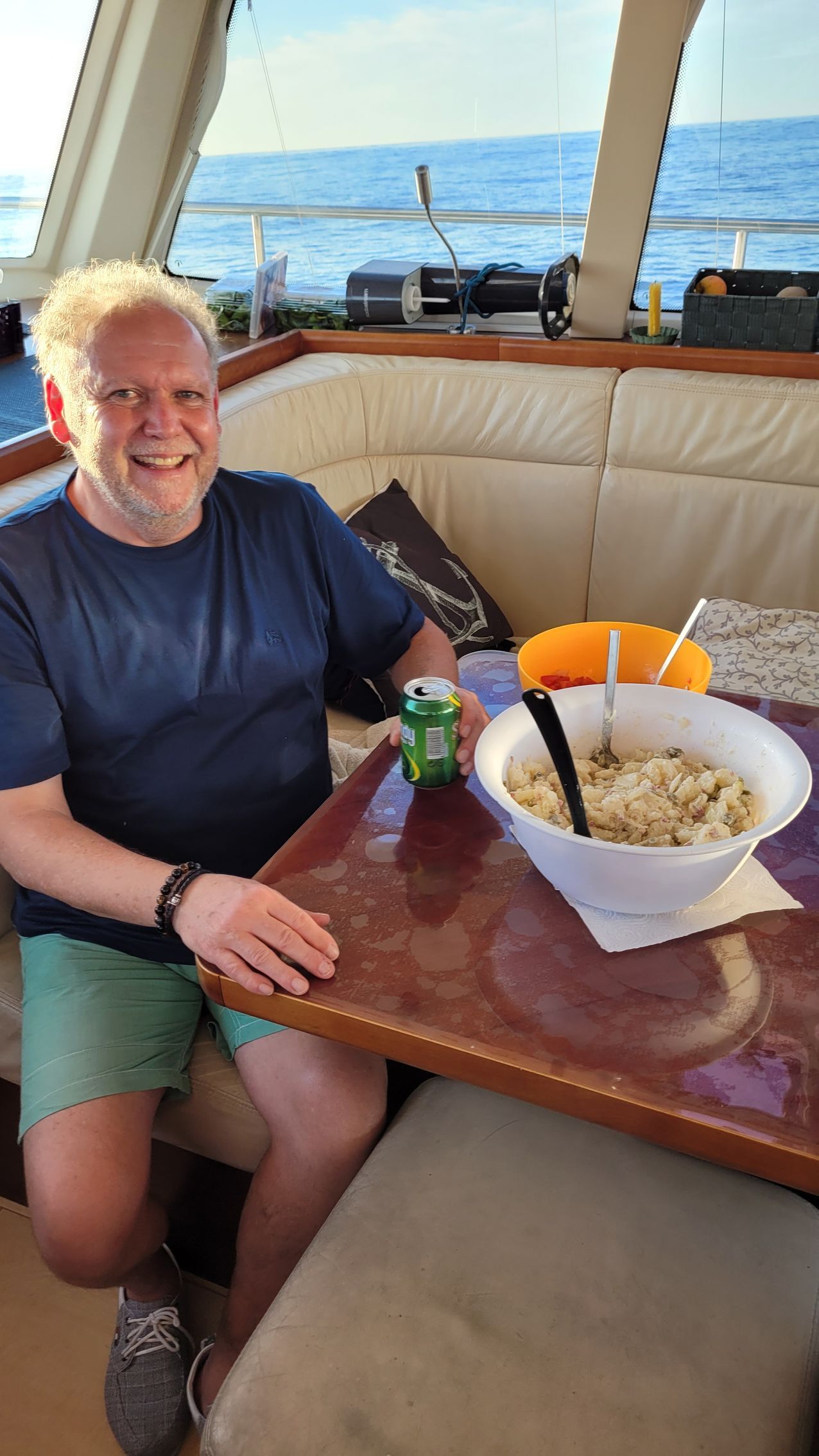 Wir haben in der Nacht so gute Fahrt gemacht, dass der Hydro-Generator genügend Strom für die Entsalzungsanlage und den Warmwasserbereiter erzeugen konnte, damit warmes Duschwasser für alle da ist. Wir Männer nehmen Gernots Angebot zum Duschen deshalb gerne an. Danach ist noch genügend Wasser da, um alle Sitzpolster abzuziehen und zu waschen. Für Gernots Fußbad ist auch noch Wasser da. Später gibt es als Snack eine Fertigsuppe und die letzte braune Banane.