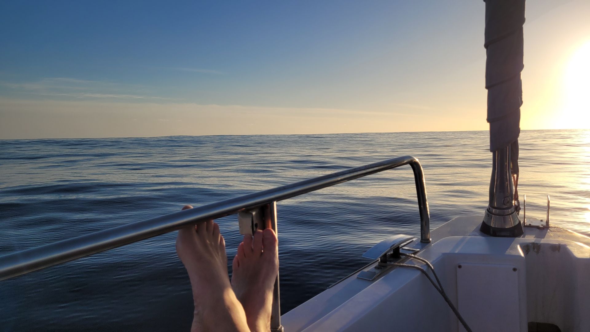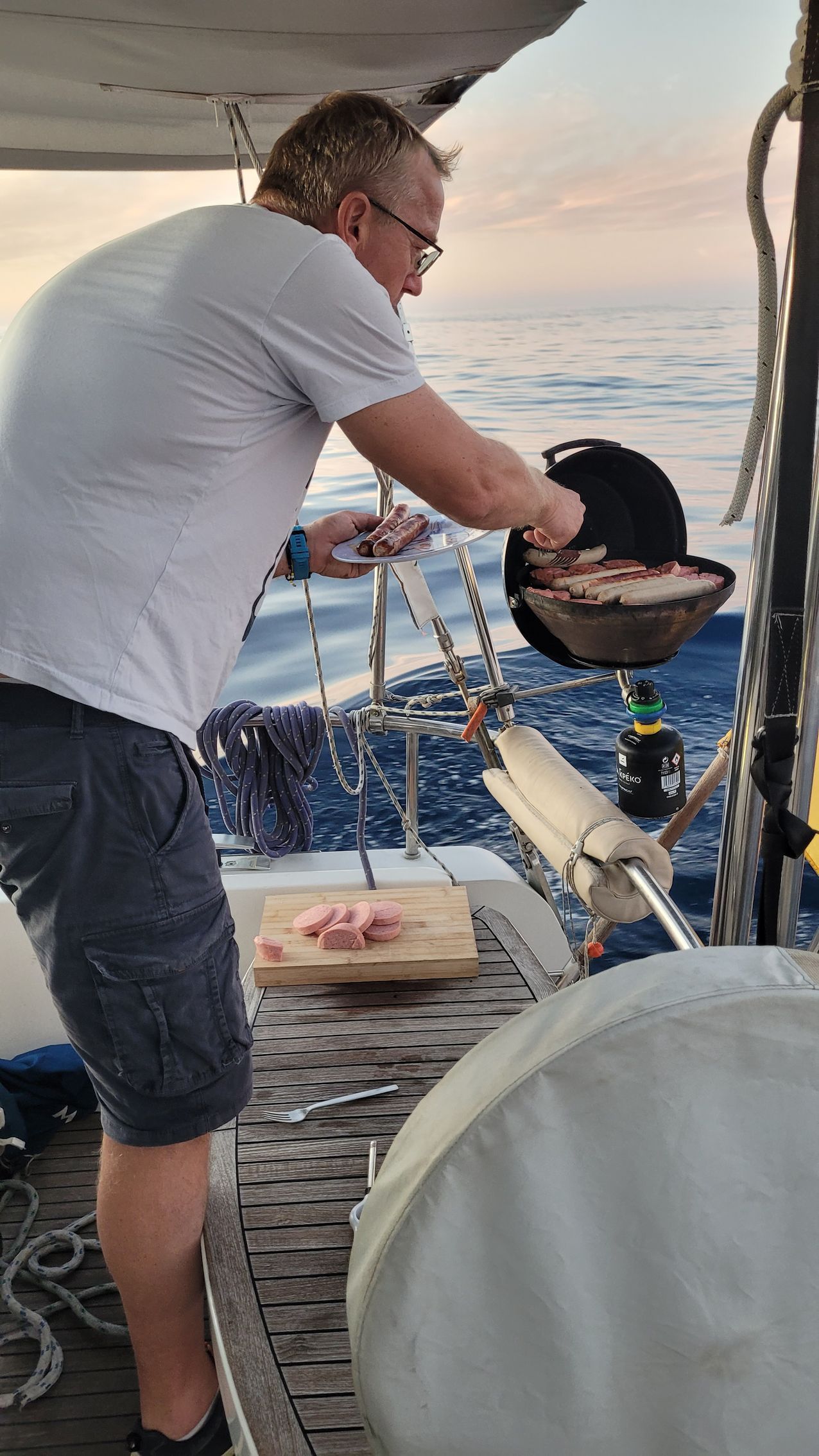 Der Sonnenaufgang ist unspektakulär und keines Fotos wert. Der Tag beginnt mit leicht diesigem Wetter, aber warm und gleichmäßigen Winden. Tom zaubert wieder ein großartiges Frühstück, diesmal mit Rührei und Speck.
