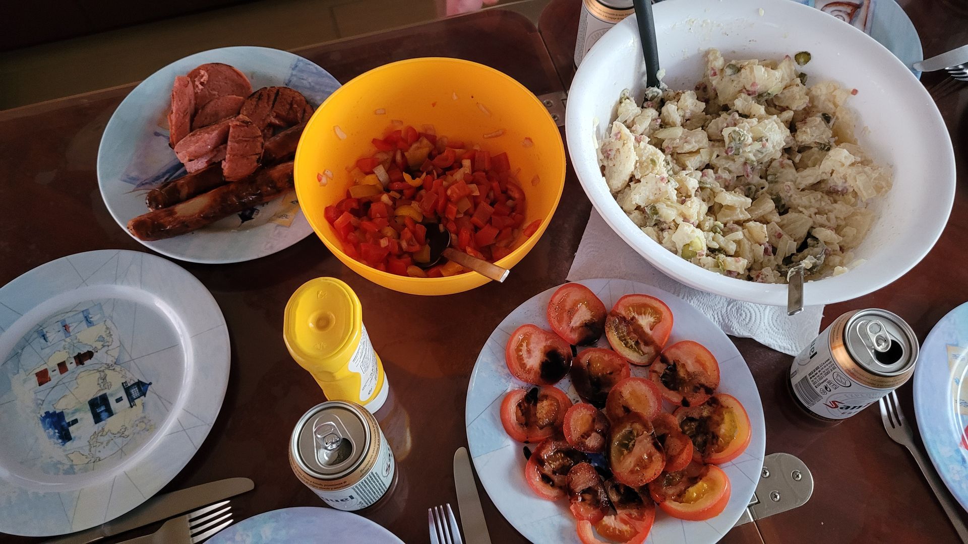 Nach Sonnenuntergang dann wieder ein fulminantes Abendessen mit Gernots Grillfleisch und -würsten und Toms Kartoffel- und Tomatensalat. Einfach klasse!