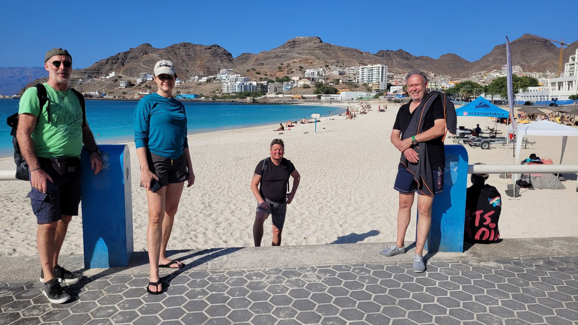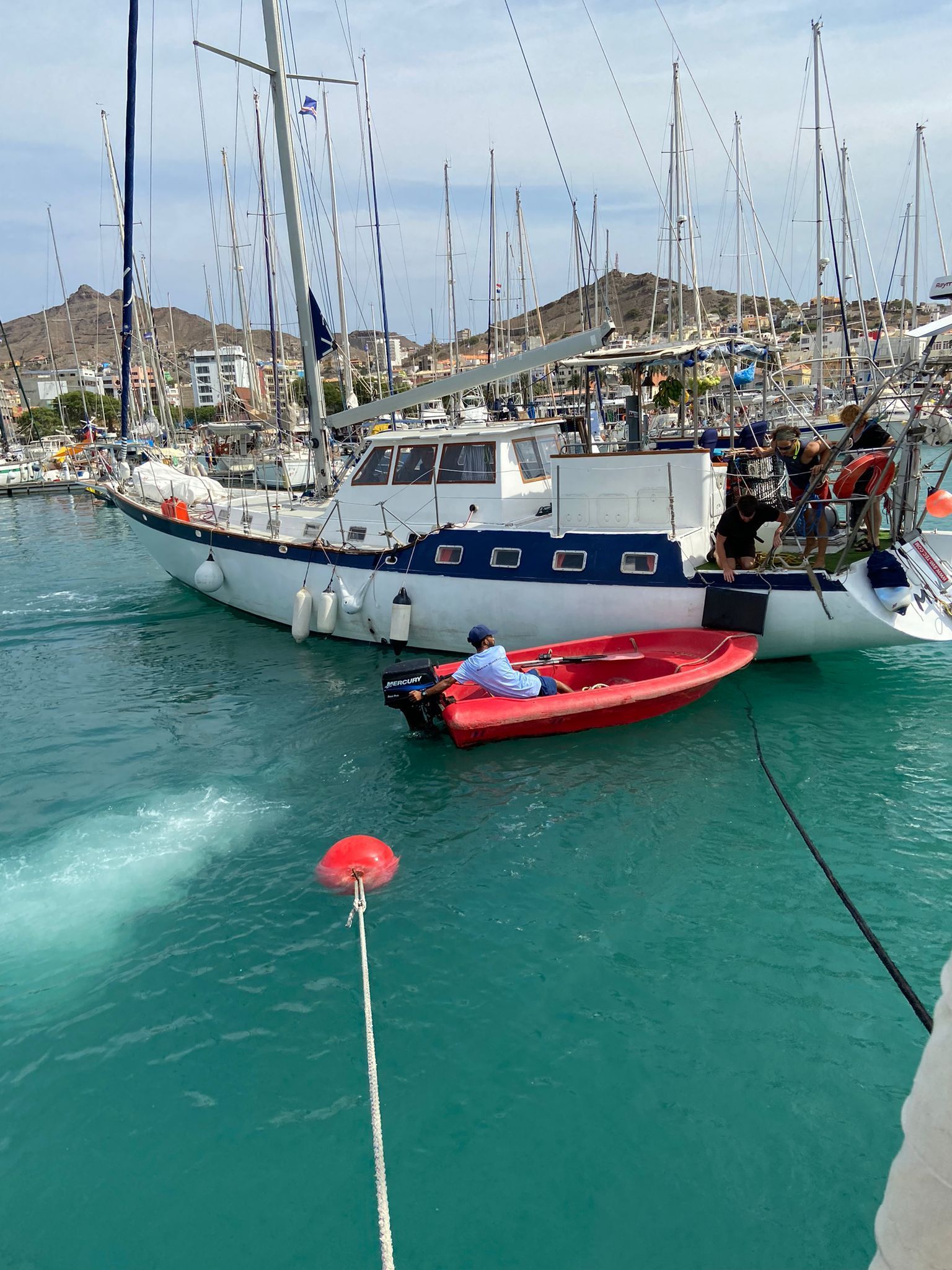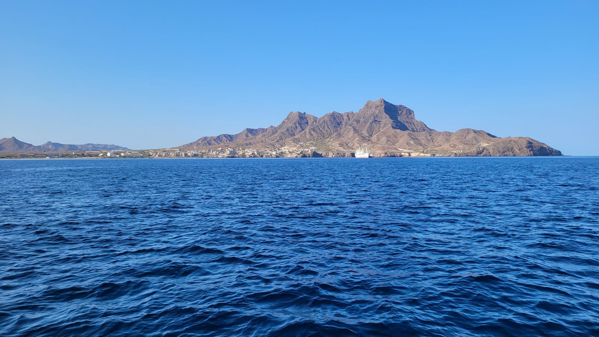 Nachts sieht Reini die ersten Lichter der Kapverden. Bei Tagesanbruch kommt die Insel Santo Antao in Sicht. Kurz darauf sehen wir Sao Vicente und Mindelo. Was für ein karger Archipel! Kurz vor 10 Uhr legen wir an der Tankstelle an und füllen unseren Dieseltank auf. Eine halbe Stunde später führt uns der Hafenlotse mir seinem roten Boot zu einer Box am Steg, wo wir festmachen. Marina und der Ort machen einen guten Eindruck. Nur Segler aus aller Herren Länder mit Segelschiffen aller Art, groß und klein, alt neu. Alle verbindet die Lust am Segeln und Reisen. Erstmal ein Ankerbier in der Marina-Kneipe, traumhaft. Wir warten auf Kerstin aus Sundsvall, Nordschweden. Sie ist eine lustige Person und gehört gleich dazu. Später macht Crew einen Spaziergang zum Strand zum Baden. Wunderbarer sauberer gelber Strand, vermutlich Saharasand, aufgeschüttet. Mit Heiko schwimme ich zur gelben Boje. Das türkisblaue Wasser hat angenehme ca. 24°, super! Abends suchen wir ein schönes Restaurant. Nachdem unser Favorit voll ist, reservieren wir einen schönen Tisch für den nächsten Tag. Wir finden ein gutes Restaurant "Chave d'Ouro" mit urigen Flair in der Altstadt. Es gibt nach längerer Wartezeit Dorade und Thunfisch-Steaks, sehr gut! Der Abend klingt bei einer Flasche Rotwein an Bord aus.