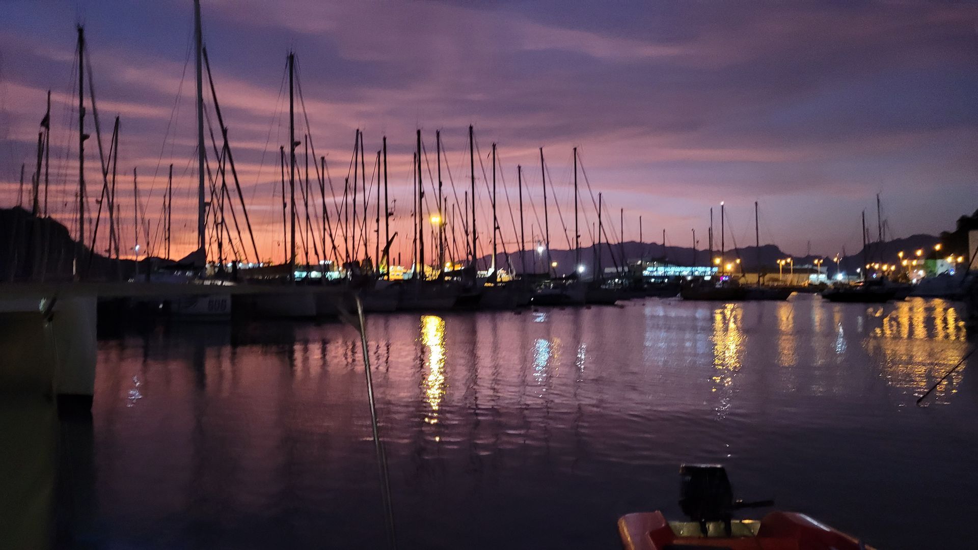 Mit Vollzeug rauschen wir mit ca. 7-8 kn in die Nacht, Kurs 275°. Nachdem bei Tom ein Squall mit Regen durchgeht, ist die übrige letzte Nachtwache stressfrei. Habe am Handy dabei 'Echoes' von Pink Floyd laufen lassen, einmalig!