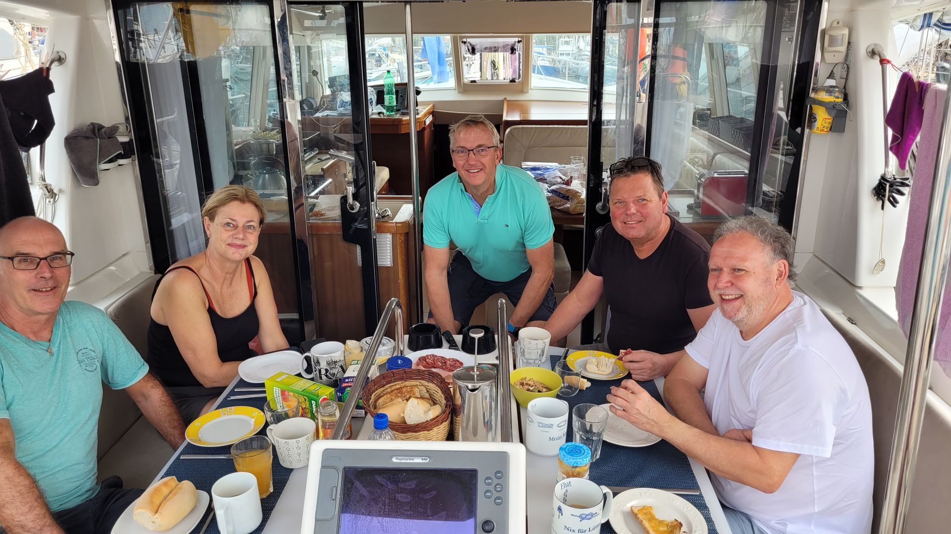 Schönes Frühstück im Cockpit bei Sonnenschein. Tom hat Rührei mit Speck für alle gemacht.