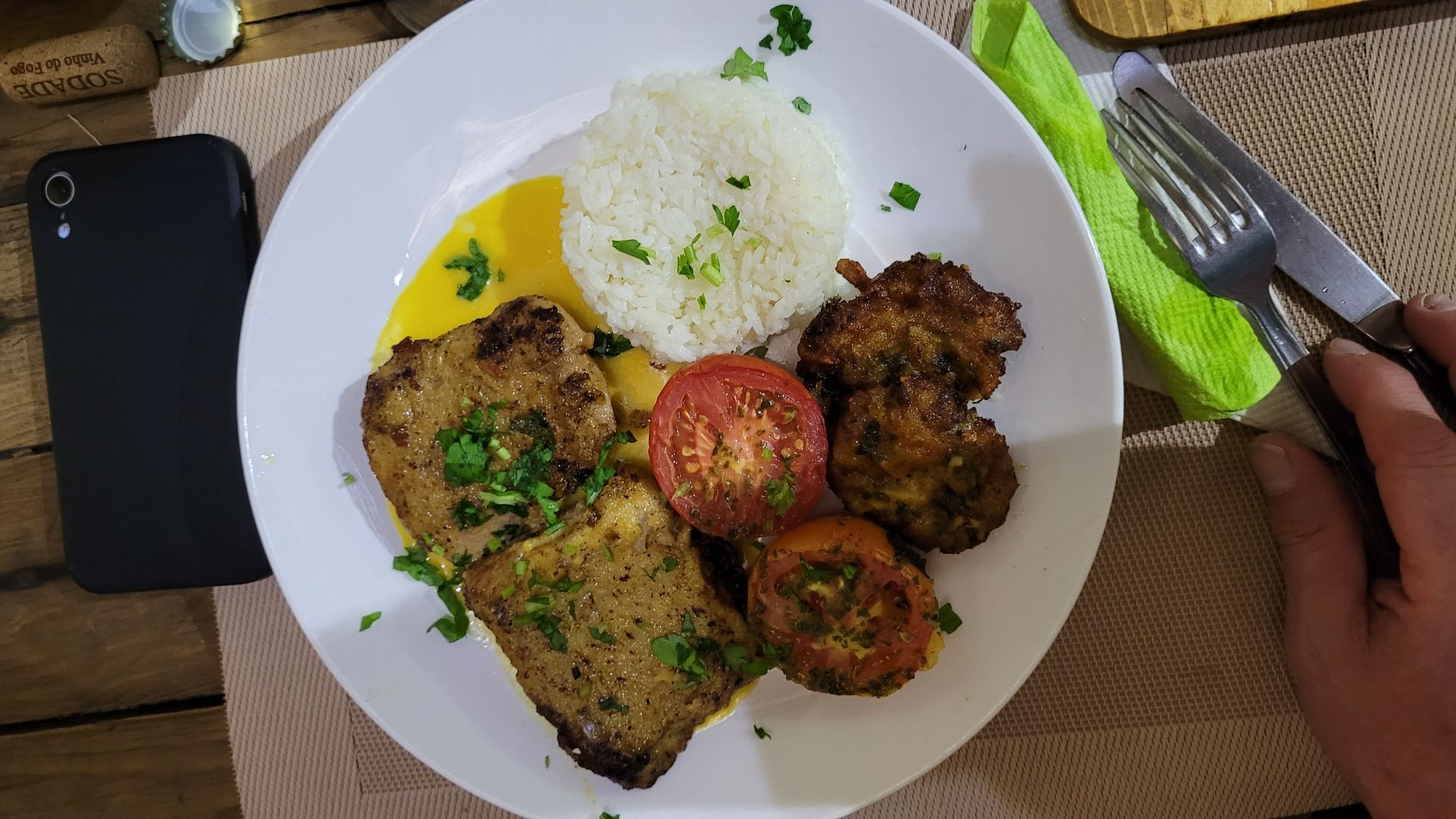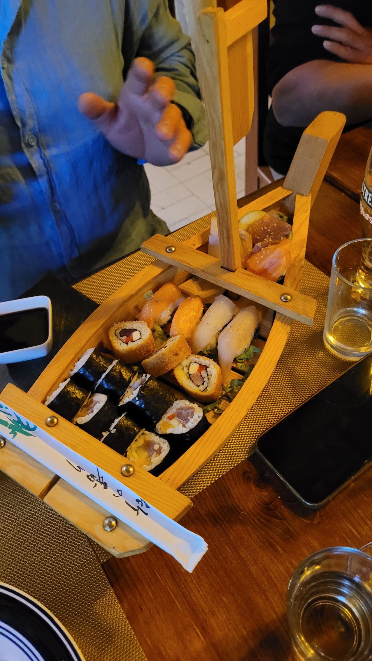 Abschluss des Tages im Restaurant "Nautilus" ganz in der Nähe während im Fernsehen Kapverden ein Spiel im Africa-Cup gewinnt. Stimmung und das Essen sind prima. Es gibt Tintenfisch, Garnelen, Fisch und Sushi.