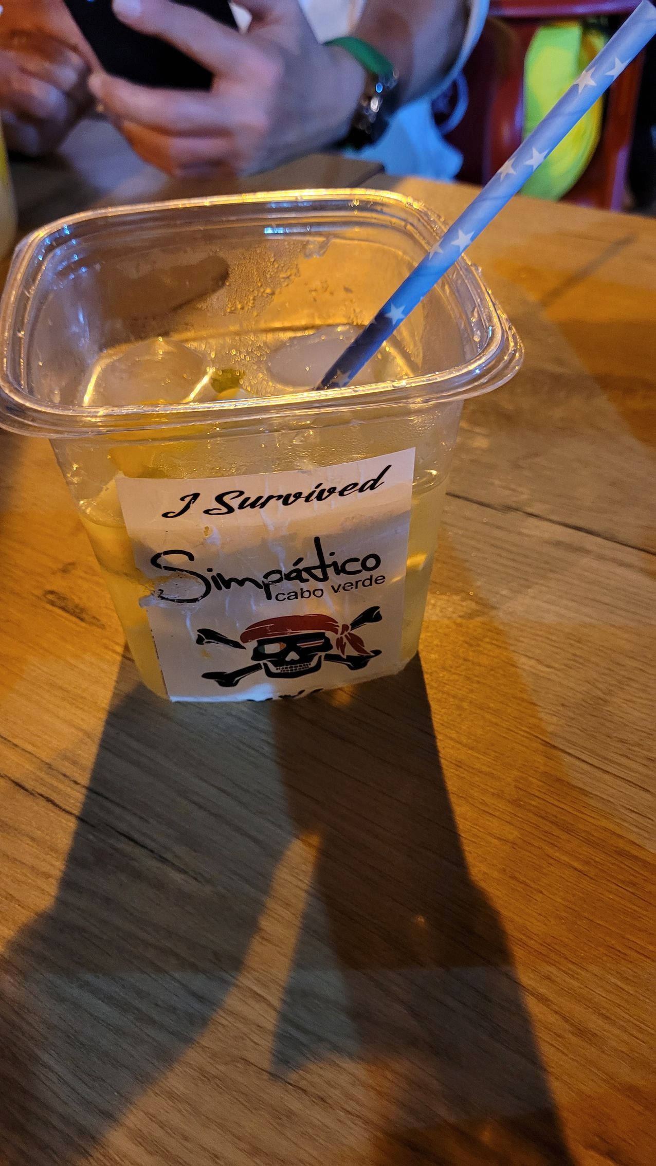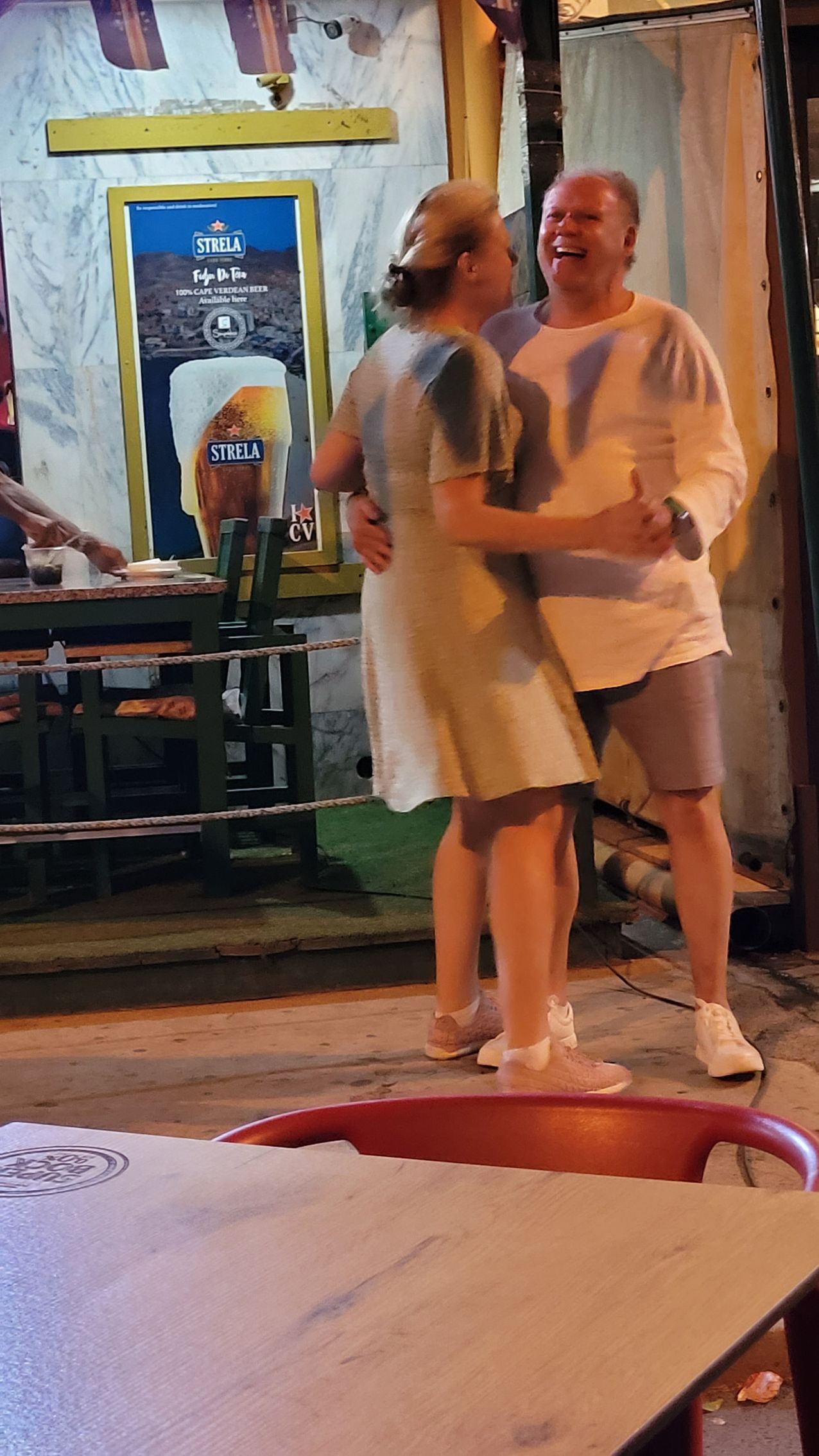 Punkt 20 Uhr sitzen wir im Restaurant "La Pergola" und essen Spezialitäten aus den Kapverden, während 2 Musiker lokale Musik machen und 2 Mädels durch das Restaurant tanzen, einmalige Atmosphäre! Als die ersten Lichter ausgehen, machen wir einen kleinen Bummel durch die Stadt. An einem kleinen Platz nehmen wir ein Eis und finden einen Platz vor einer Bühne wo ein Musiker Fado live spielt. Tom spendiert eine Runde Caipirinha und jeder darf mal mit Kerstin tanzen. Sie sprüht vor Energie!