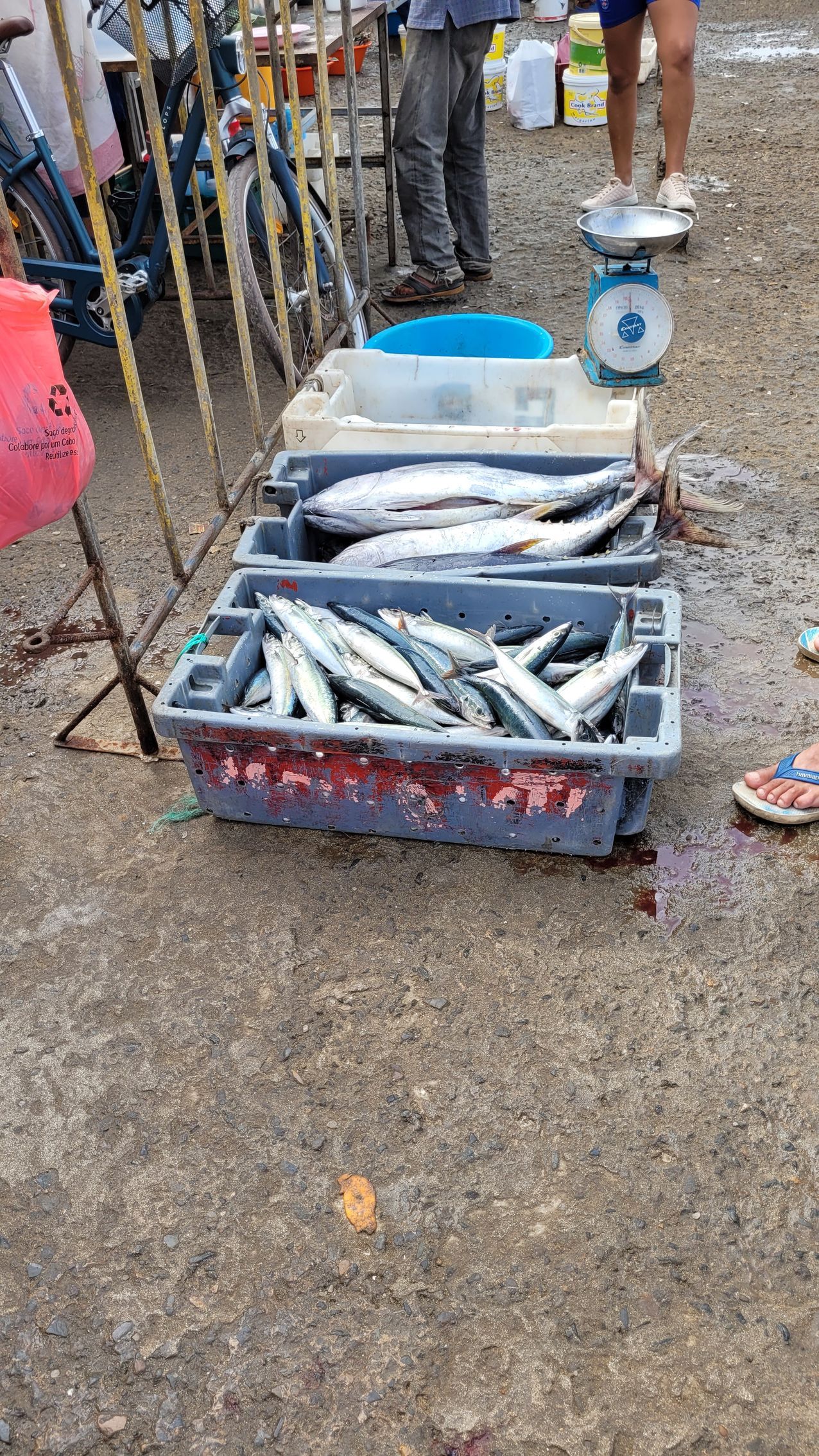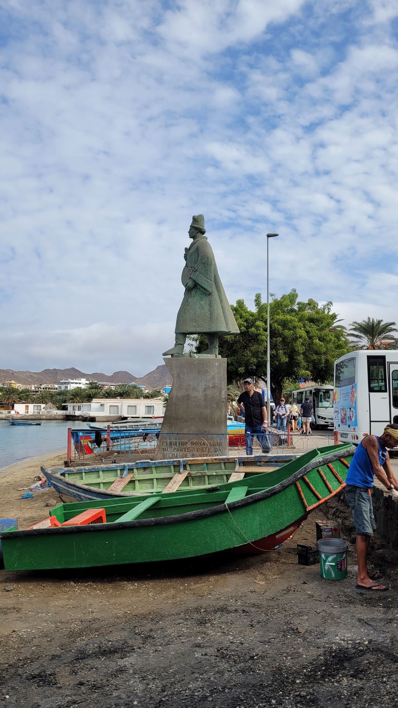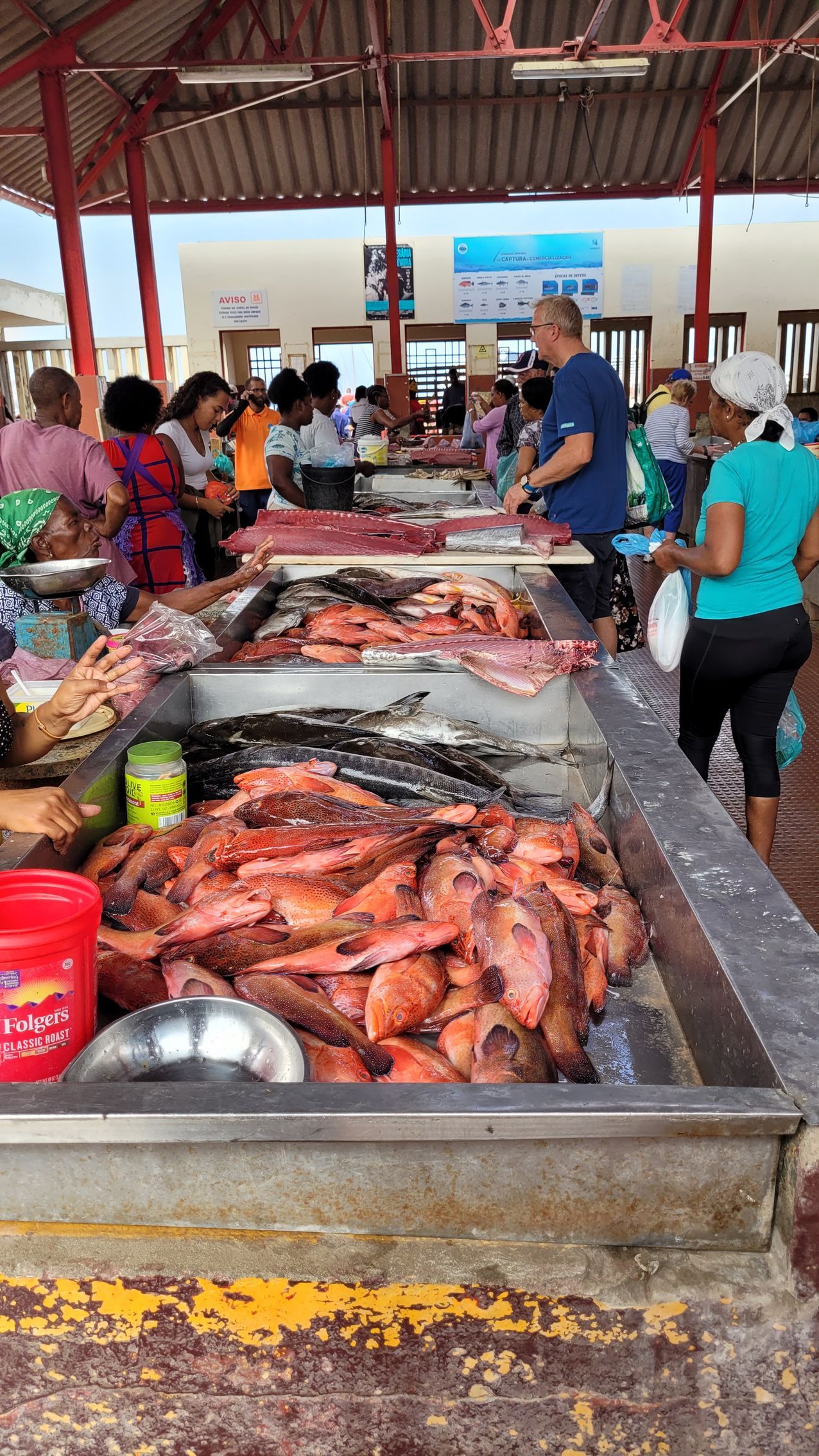 Heute ist der große Tag der Abreise aus der 'alten' Welt. Gernot klariert uns erstmal bein Zollamt aus. Wir beschließen, nach dem Frühstück alle nochmal zum Einkaufen in die Stadt zu laufen für letztes Gemüse auf dem Gemüsemarkt und frischen Fisch auf dem Fischmarkt. Frisches Obst finden wir in einem kleinen Laden. Während das Angebot im Gemüsemarkt eher bescheiden ist, bietet der Fischmarkt ein großes Angebot. Neben dem Fischmarkt die eindrucksvolle Bronzestatue von Diogo Alfonso, einheimischer Seefahrer im 15. Jahrhundert, der nach Westen auf Porto Grande Bay blickt. Er hat die afrikanische Westküste erforscht.
