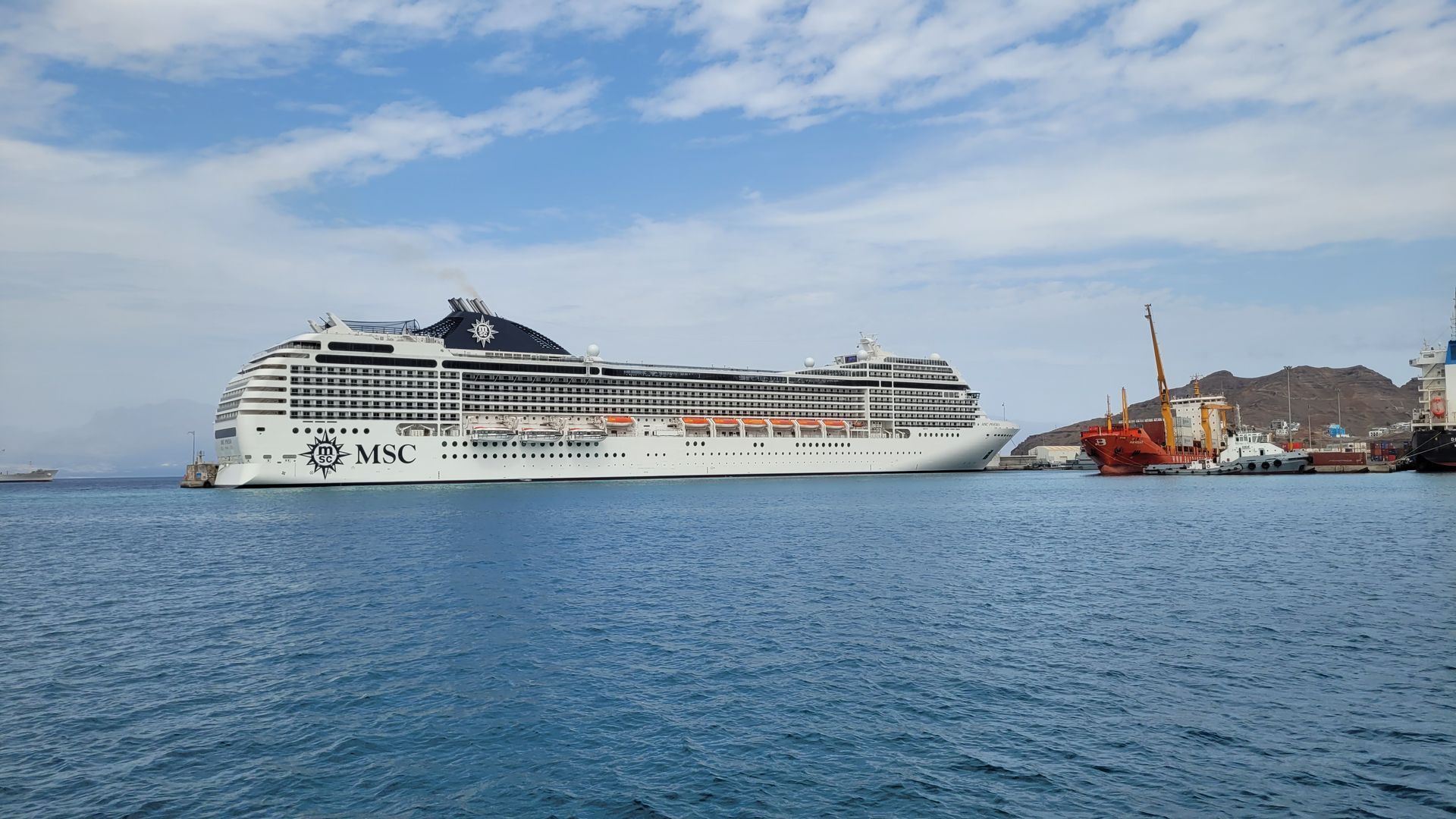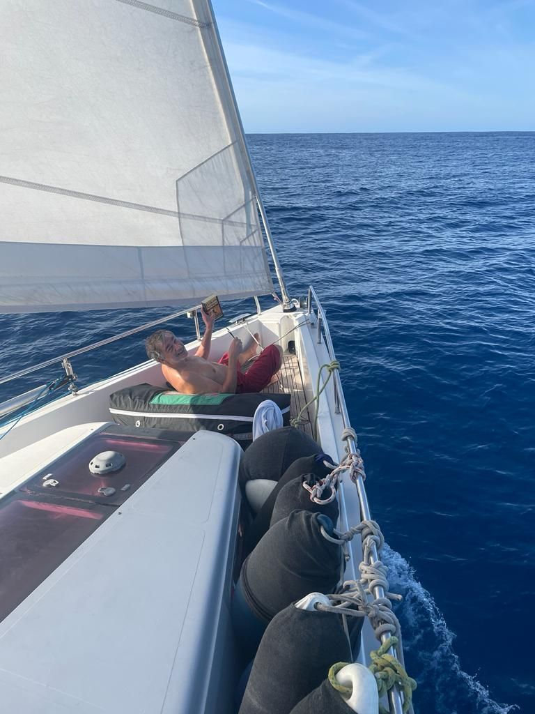 Um 12 Uhr gelingt uns ein perfektes Ablegemanöver unter dem typischen Hupen etlicher anderer Yachten. Wir stechen in See, 2026 sm (Seemeilen) liegen vor uns bis Barbados, das in 14 Tagen erreicht werden sollte. Wir passieren das Kreuzfahrtschiff "MSC Poesia", das uns um 7 Uhr bei der Einfahrt mit lautem Tuten geweckt hat Gerade fluten die Passagiere in rentnerbeigen kurzen Hosen und mit Digital kameras bewaffnet dss Schiff. Nach der Hafenausfahrt werden die Segel gesetzt und wir segeln erst mit Schmetterling, später auf Backbordbug nach Westen, Eine kleine Flautenzone durchqueren wir mit Motorunterstüzung. Kurs 260°, 6 -8,2 kn, Windstärke 3-4. Tom zaubert unter sehr erschwerten Wellenbedingungen 4 gebratene Fische mit Kartoffeln. Mit Reinis Salat ein tolles Abendessen, danke Euch!