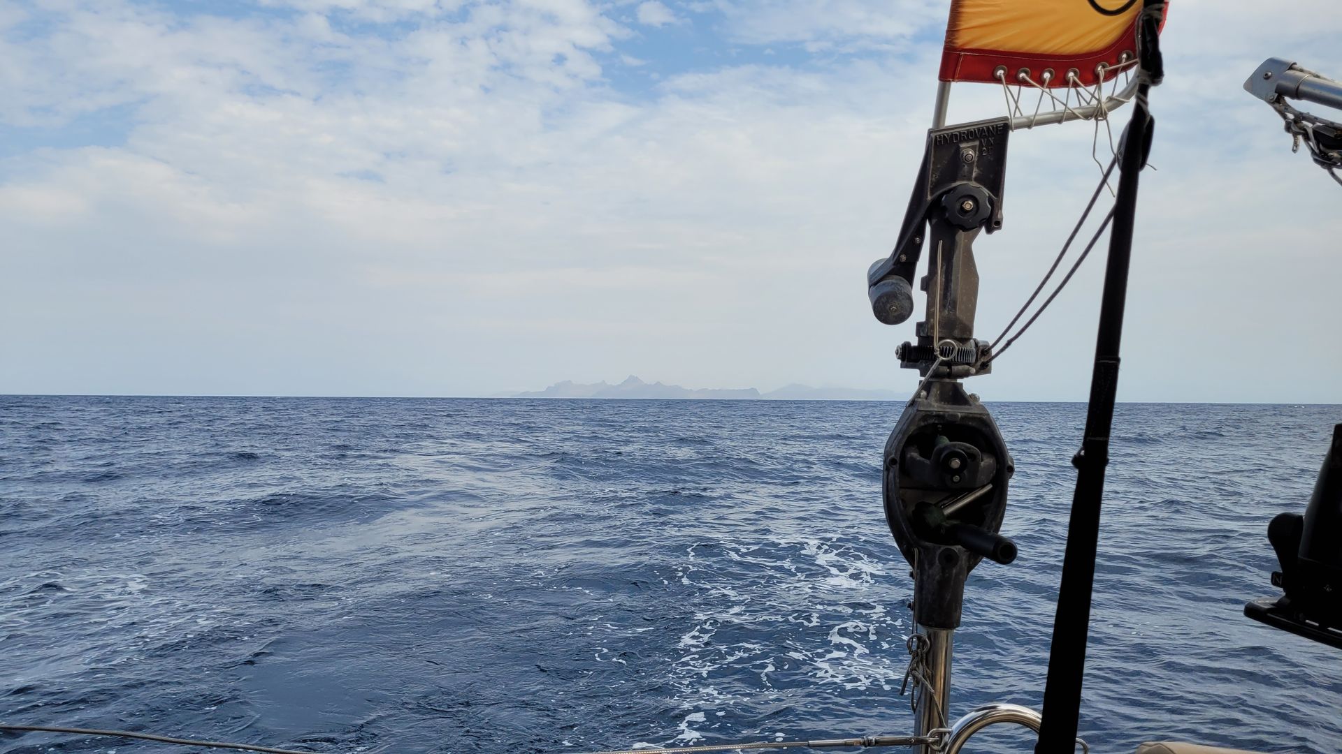 In der Nacht werden wir von 2 kleinen Unwetterfronten überholt. Die mechanische Selbststeueranlage mit dem Windflügel hat Mühe, den Kurs in den Böen zu halten. Nach Prüfung der Batterieleistung entscheiden wir uns für den elektrischen Autopilot und legen die Windfahne fest.