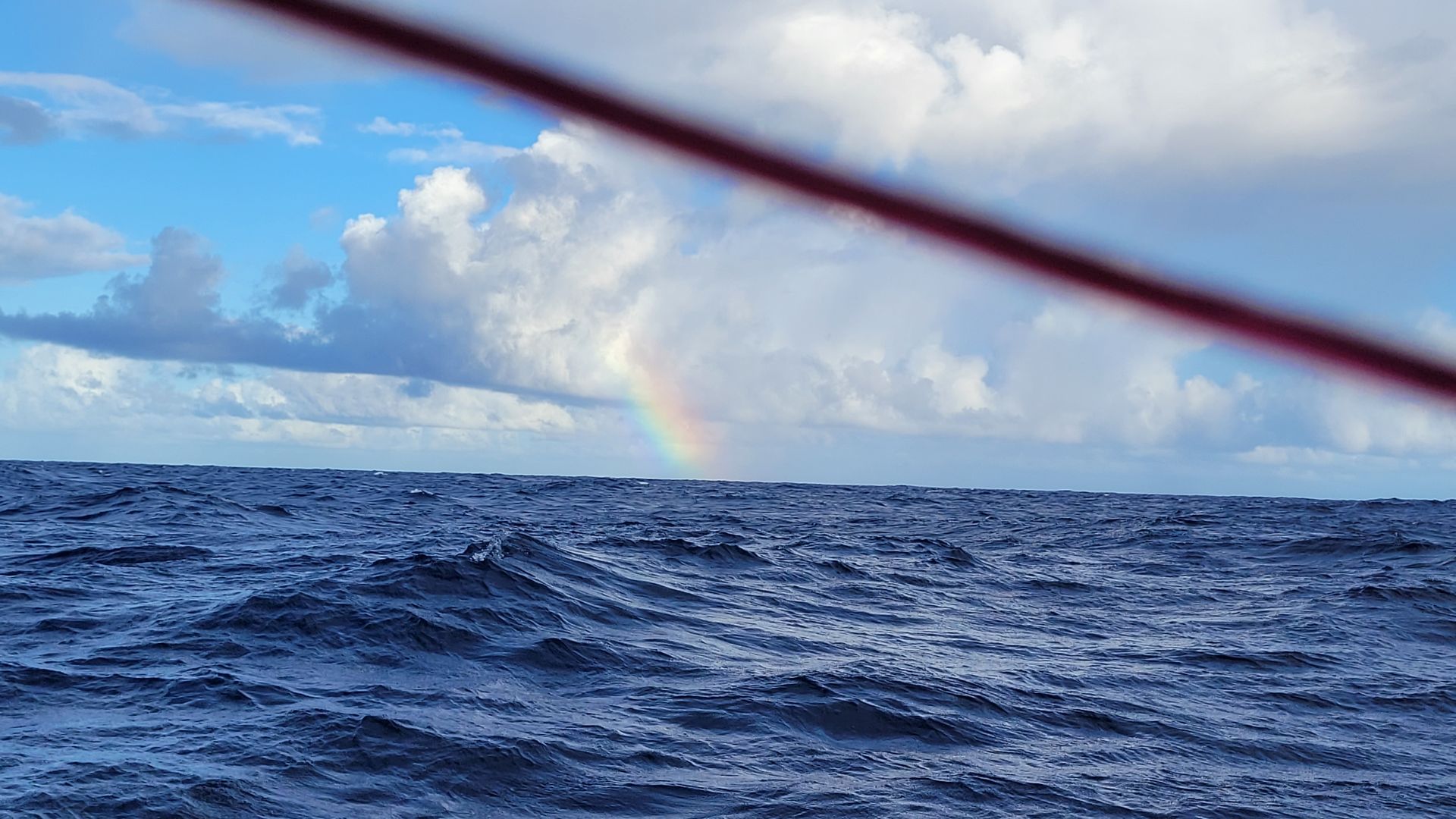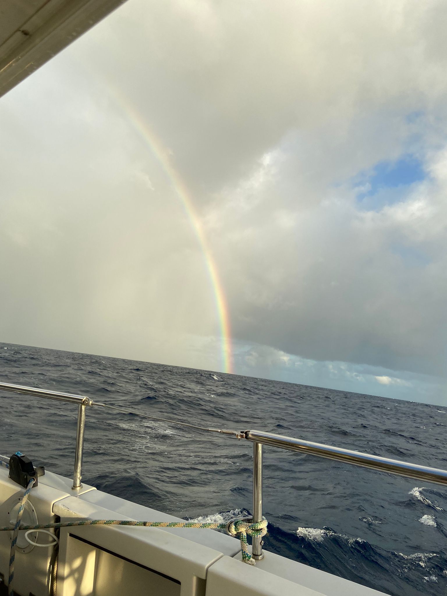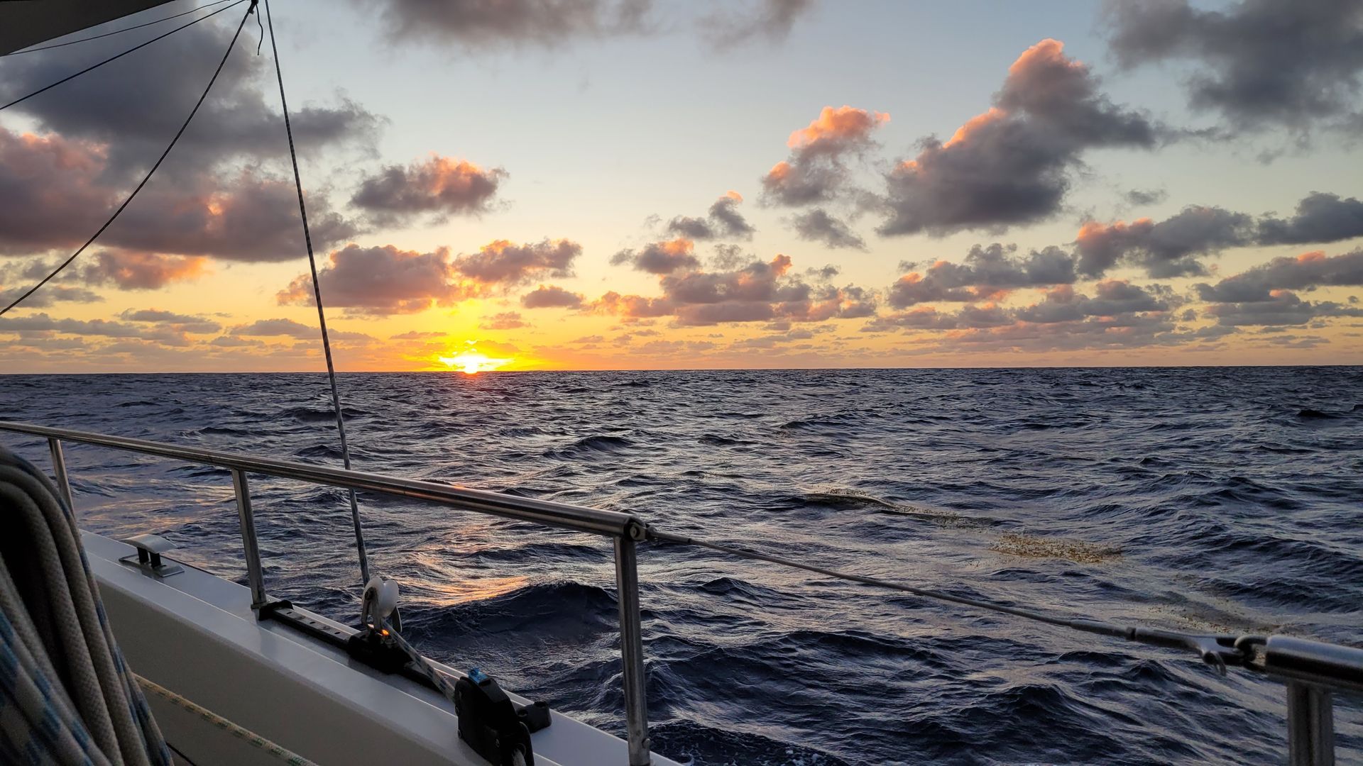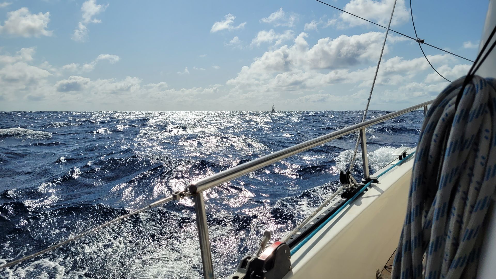 Am Morgen reißt beim Durchgang eines Squalls die nächste Leine, der Baumniederholer für den Spinnakerbaum. Problem.wird aber schnell gelöst. Wir segeln auf Steuerbordbug weiter mit ca. 7 kn gen Westen 260-270°. Nach dem Frühstück im Cockpit legen wir die Genua um auf Backbordbug und fahren einen höheren Kurs ca. 300°.
