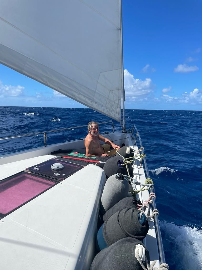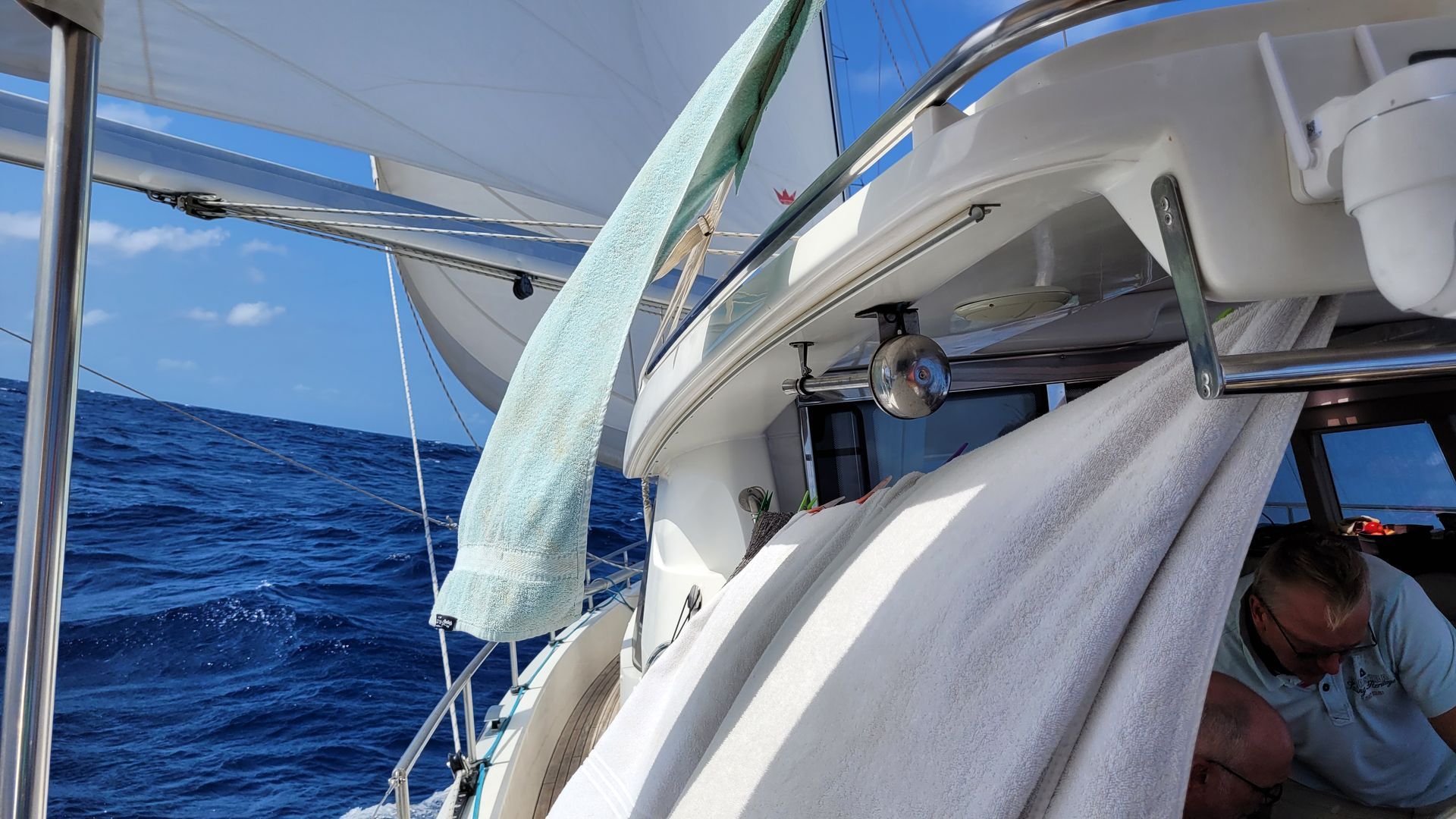 Gernot wechselt die Wasserfilter und die Dichtungen der Gästetoilette. Es werden Schätzungen auf die Ankunftszeit in Barbados abgegeben. Auf dem Vorschiff und hinter den Steuerrädern ist fast immer ein sonniges Plätzchen.