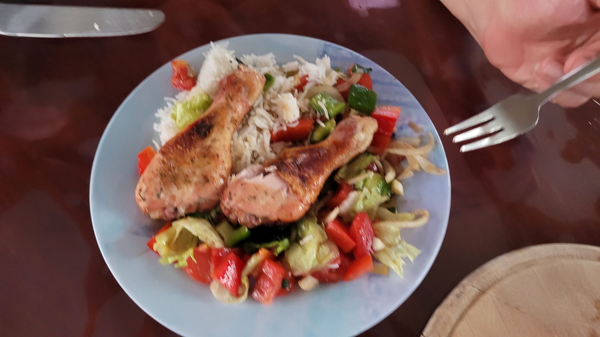 Tom zaubert als Abendessen Hähnchen mit Reis und Salat, frische Ananasstücke als Dessert. Dabei schöner Sonnenuntergang im Salon.