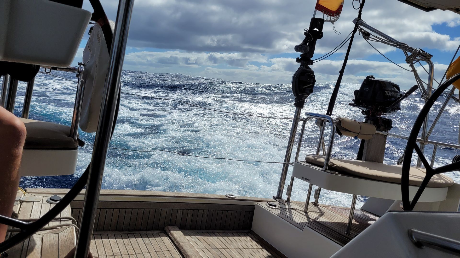 Später hat sich wieder ein fliegender Fisch ins Cockpit verflogen. Trotz heftigen Gezappels schaffe ich es, das glitschige Tier wieder in die schäumende Heckwelle zu befördern. Ich denke, wir sind beide erleichtert darüber.