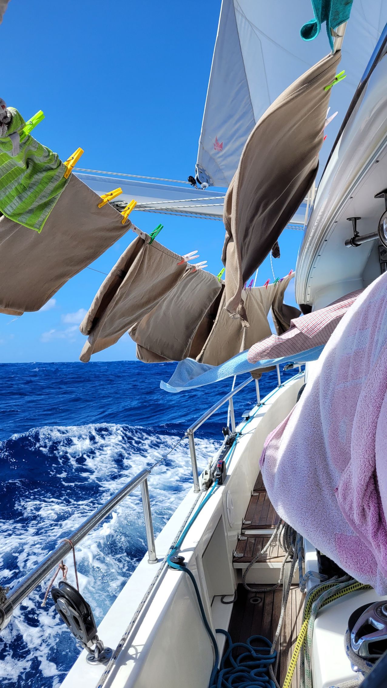 Nachtwache wie zuvor wieder stressfrei. Am Morgen ist zuhause fast überall schulfrei wegen Glatteis. Kann man sich hier nicht vorstellen. Haben andere Probleme: Eine fremde Leine hat sich am Hydro-Generator verfangen. Zum Glück können Gernot, Reini und Heiko das wieder klar machen. Der Hydro-Generator ist besonders nachts unser Stromerzeuger. Wir haben jedoch soviel Geschwindigkeit, dass wir den überschüssigen Strom für die Wasserentsalzung und Wassererwärmung verwenden können. So kommt die positive Botschaft gerade recht, dass alle mal in der Skipper-Dusche duschen dürfen. Herrlich! Die Trocknung der Handtücher übernimmt unser voll klimaneutraler Wäschetrockner auf der Backbord-Wäscheleine.