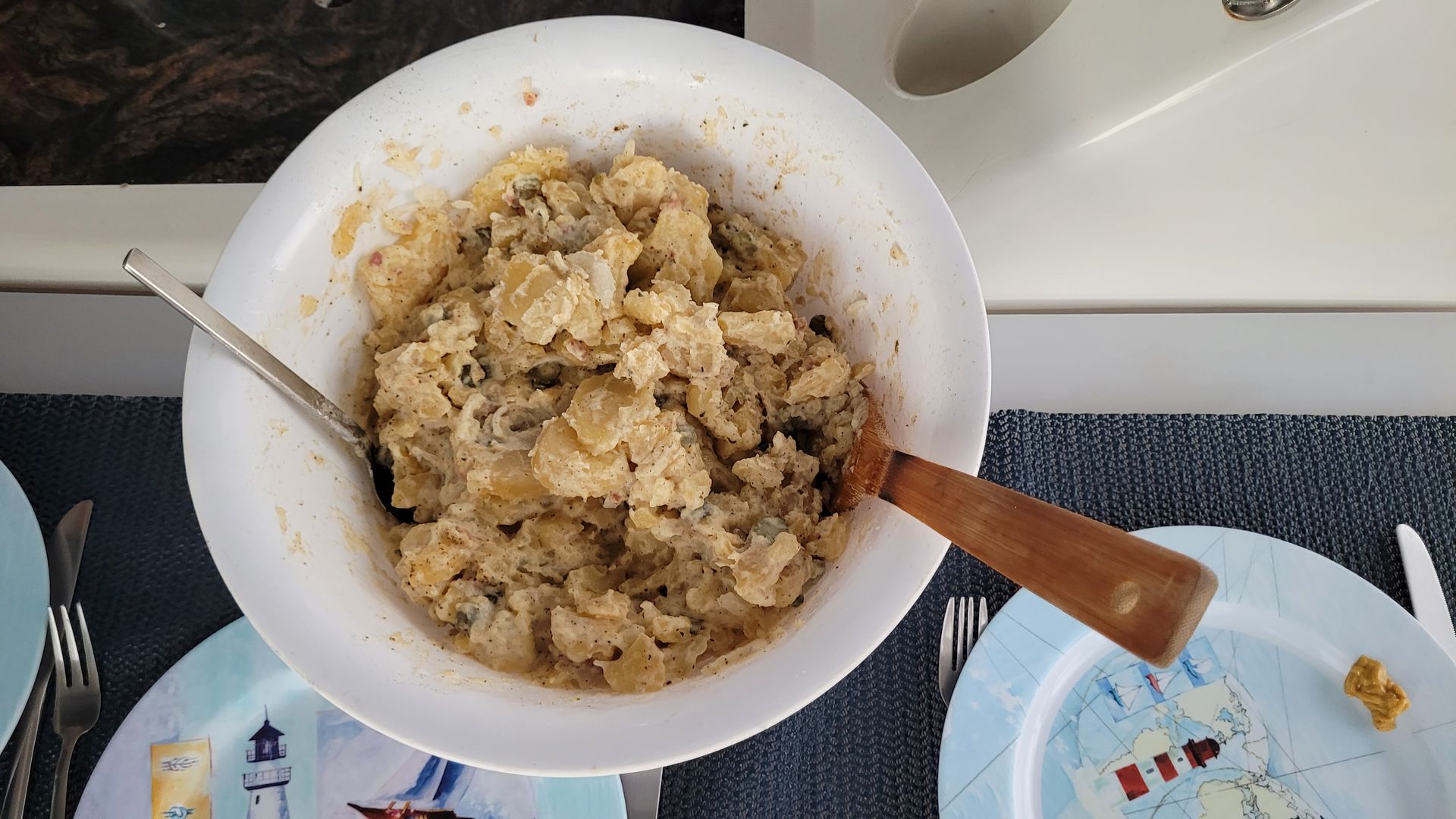 Zum Abendessen hat Tom leckeren Kartoffelsalat vorbereitet. Dazu gibt es Wienerle aus dem Glas. Diese sind aber eher zu weich.