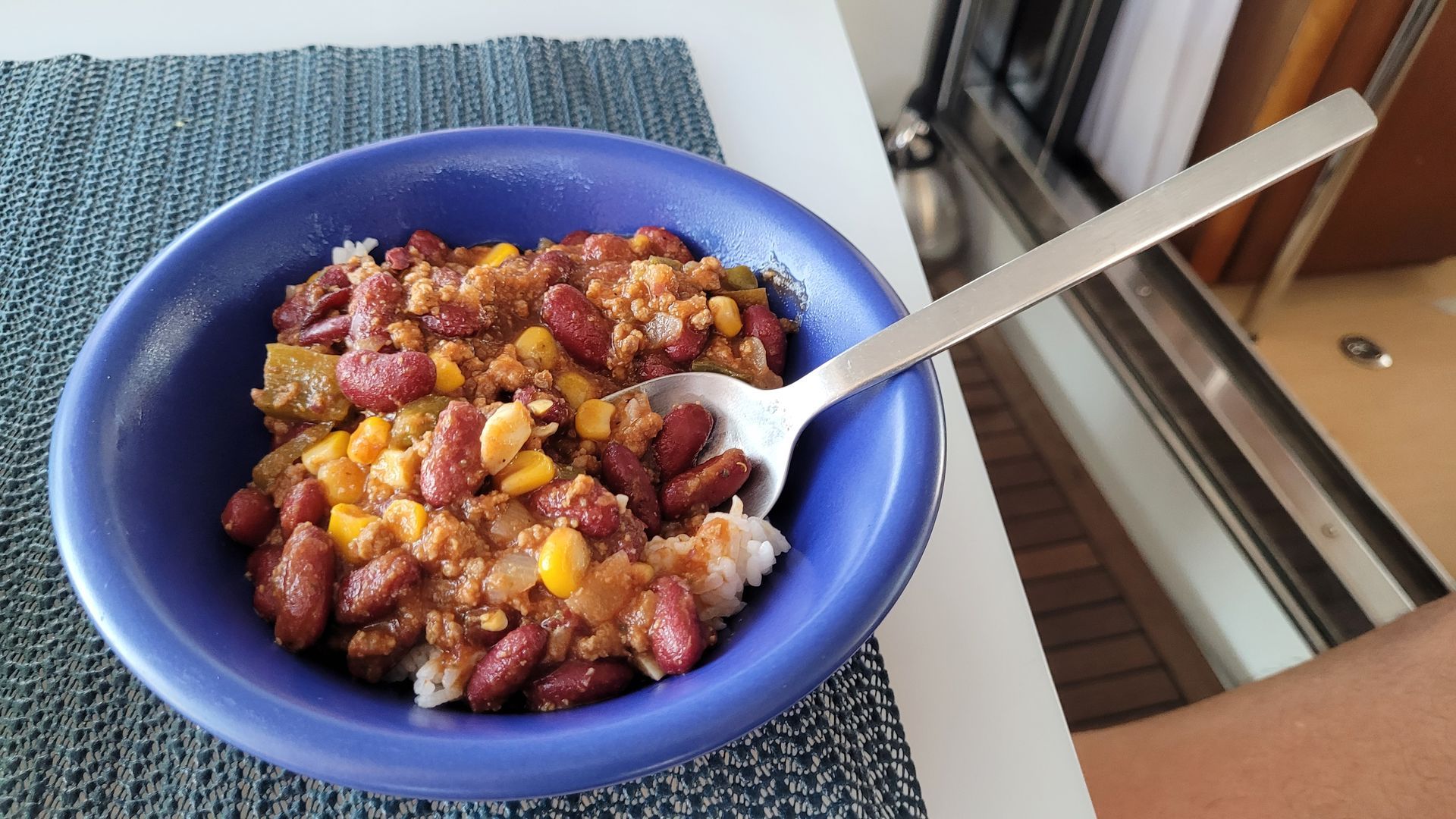 Abends zaubert Tom köstliches Chili con Carne, dazu gibt es guten 2017er Rotwein aus Rioja.