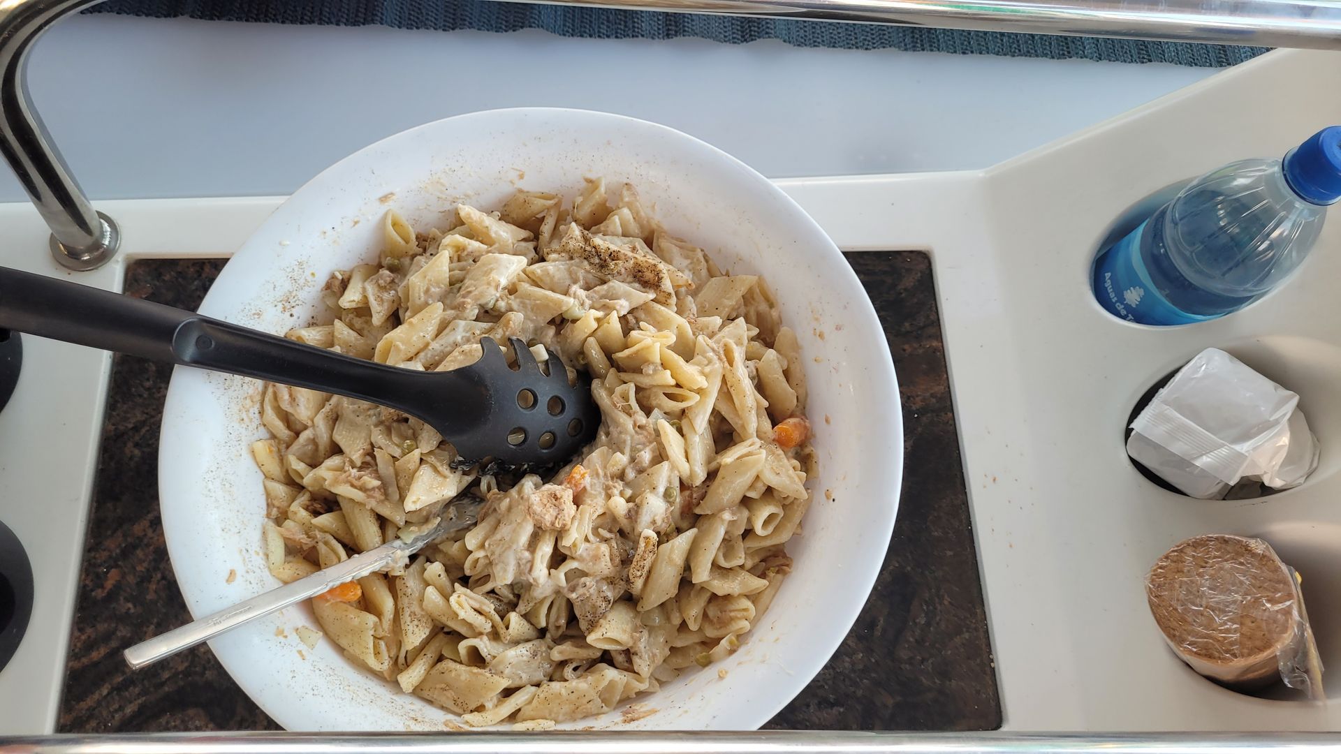 Abends kocht Tom ohne Verwendung von irgendwelchen Fertigprodukten herrliche Spaghetti Carbonara und serviert es in Schälchen. Bei einer größeren Welle entkommt einem Crewmitglied sein volles Schälchen, saust quer durch den Salon und landet prompt auf der falschen Seite. Das Chaos wird aber schnell mit vereinten Kräften behoben.