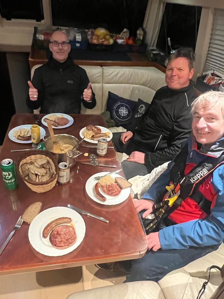 Danach erfolgt eine kleine Reparatur am Großbaum durch Reini und Heiko. Abends zaubern die Jungs unter Anleitung von Tom wieder ein Spitzen-Abendessen. Es gibt Schweine-Steaks und Hähnchenfleisch mit Bratkartoffeln und Salat. Der Seegang macht Kochen und Essen zur akrobatischen Herausforderung. Hat trotzdem sehr gut geschmeckt!