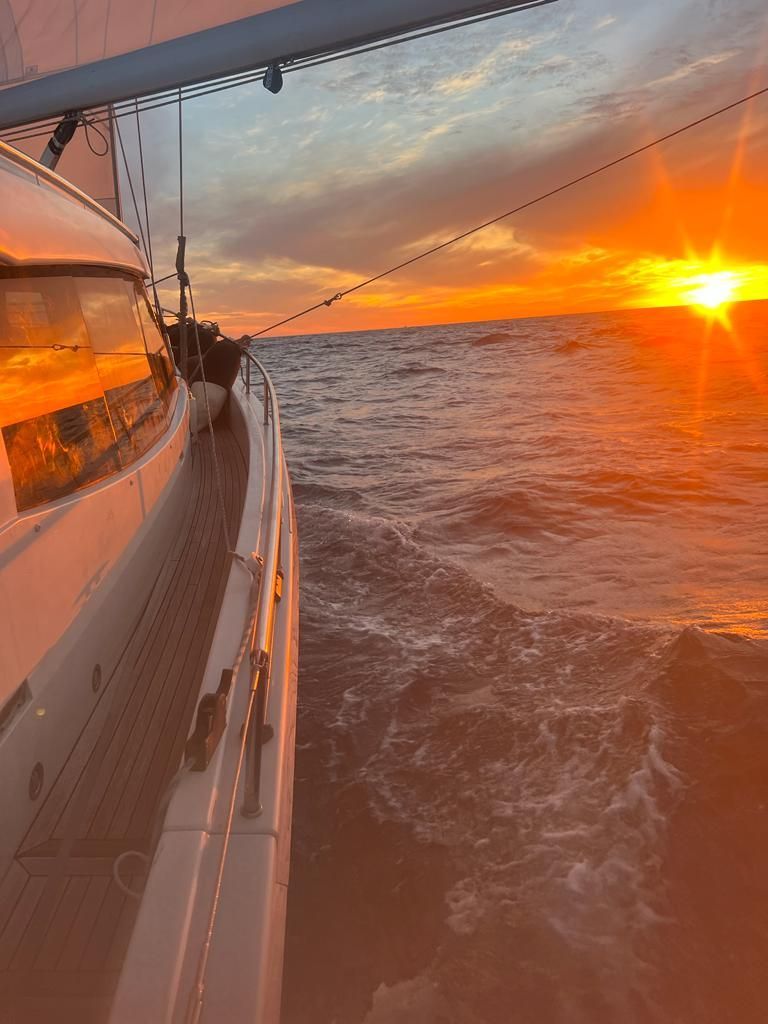 Am Morgen sind Windstärke 3-4 und Geschwindigkeit 7-8 kn immer noch so wie am Vortag. Überraschenderweise ist nur noch der Katamaran an Backbord querab. Katamarane sind grundsätzlich schneller als Einrumpfboote, aber "Oracle".haben das Großsegel gerefft. Um 17 Uhr bleiben sie schließlich zurück. Mittags legt Skipper mit uns die Notrollen fest, das sind die Aufgaben, die in einem Notfall jeweils von wem zu übernehmen sind. Jedes 2er Team hat ein Ersatzteam. Tagsüber sind vereinzelt fliegende Fische zu sehen, die über die Wellen segeln. Tom verwöhnt uns abends mit einer Schale Chorizo mit Kartoffeln, Pimiento und Ei, sehr gut!