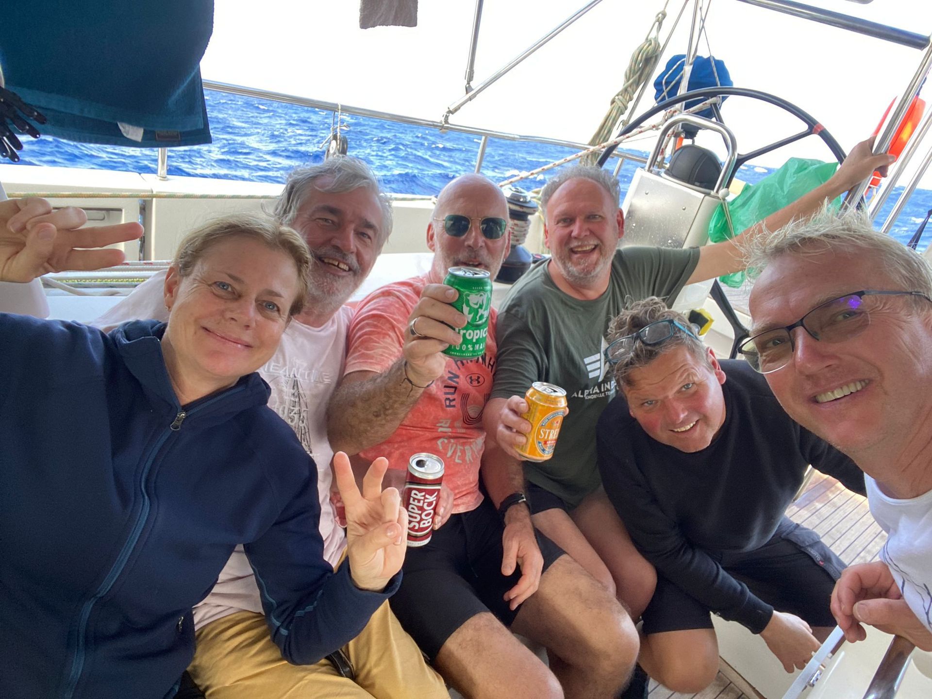 Um 14:45 Uhr feiern wir Bergfest mit einem Bier. Wir haben die Hälfte der Strecke Mindelo-Barbados geschafft.Gernot prostet Neptun zu und ihm mit einem Schluck ins Meer für die gute Überfahrt.