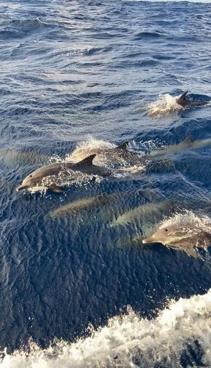 Am Nachmittag und Abend begleiten uns 2 mal Delphin-,Schulen. Sehr schön, aber schwer zu fotografieren!!